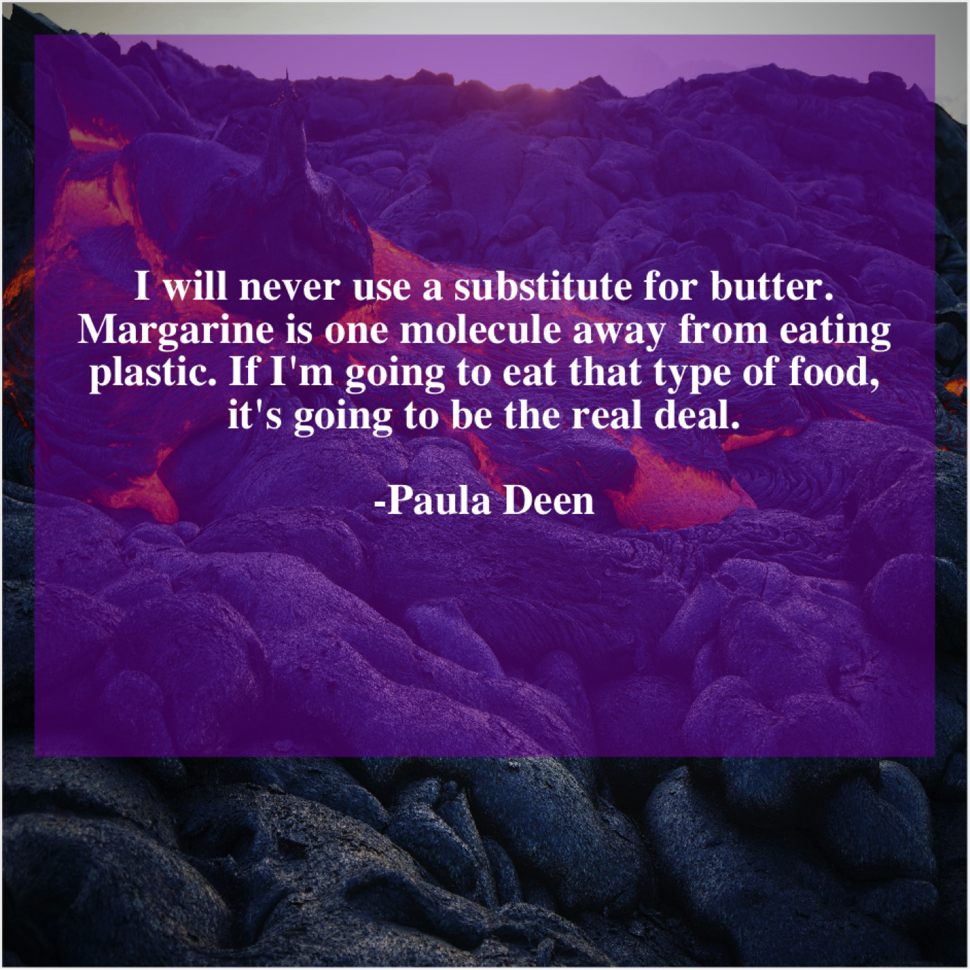 Paula Deen Paula Deen – I will never use a… November 27, 2018 admin “I will never use a substitute for butter. Margarine is one molecule away from eating plastic. If I’m going to eat that type of food, it’s going to be the real deal.”-Paula Deen