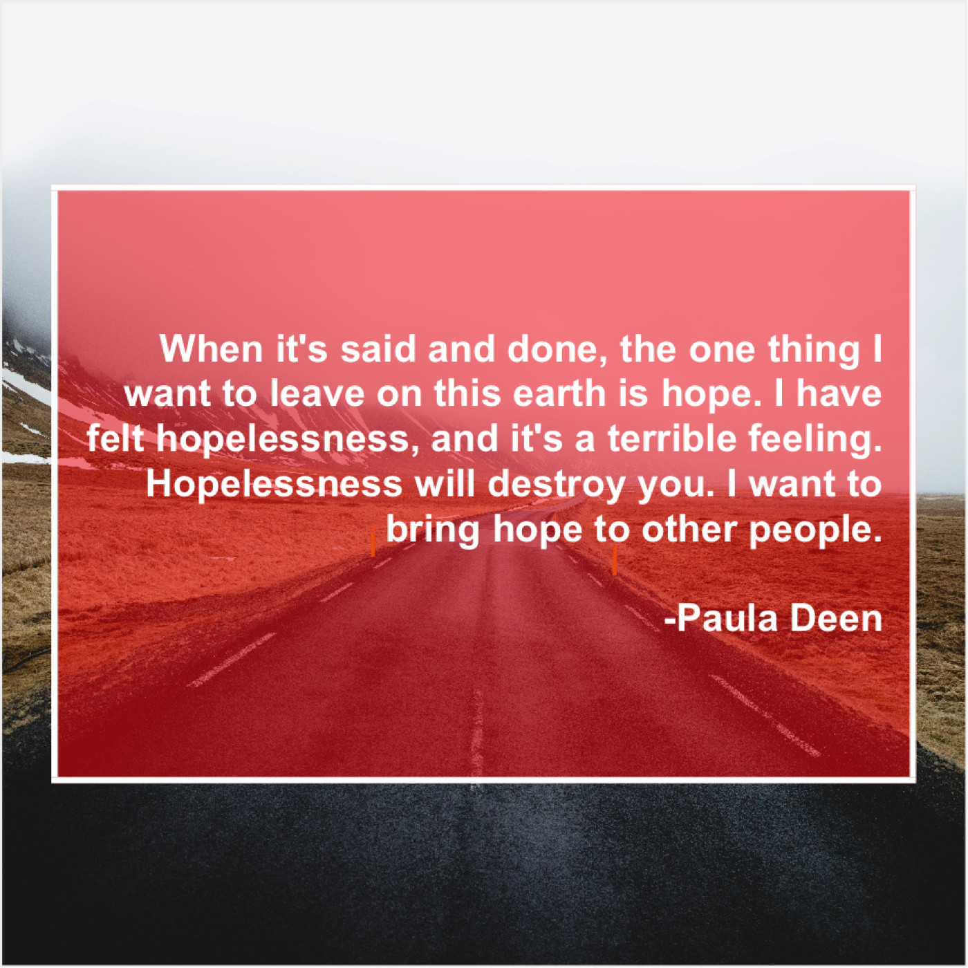 Paula Deen Paula Deen – When it’s said and done… December 23, 2018 admin “When it’s said and done, the one thing I want to leave on this earth is hope. I have felt hopelessness, and it’s a terrible feeling. Hopelessness will destroy you. I want to bring hope to other people.”-Paula Deen
