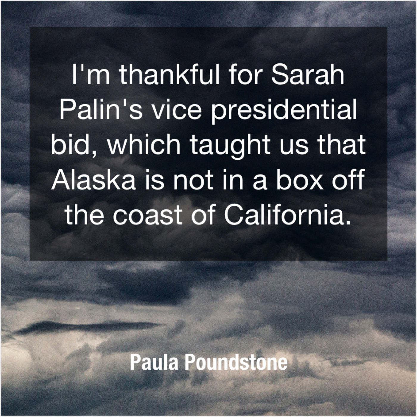 Paula Poundstone Paula Poundstone – I’m thankful for Sarah Palin’s… May 2, 2019 admin “I’m thankful for Sarah Palin’s vice presidential bid, which taught us that Alaska is not in a box off the coast of California.”-Paula Poundstone