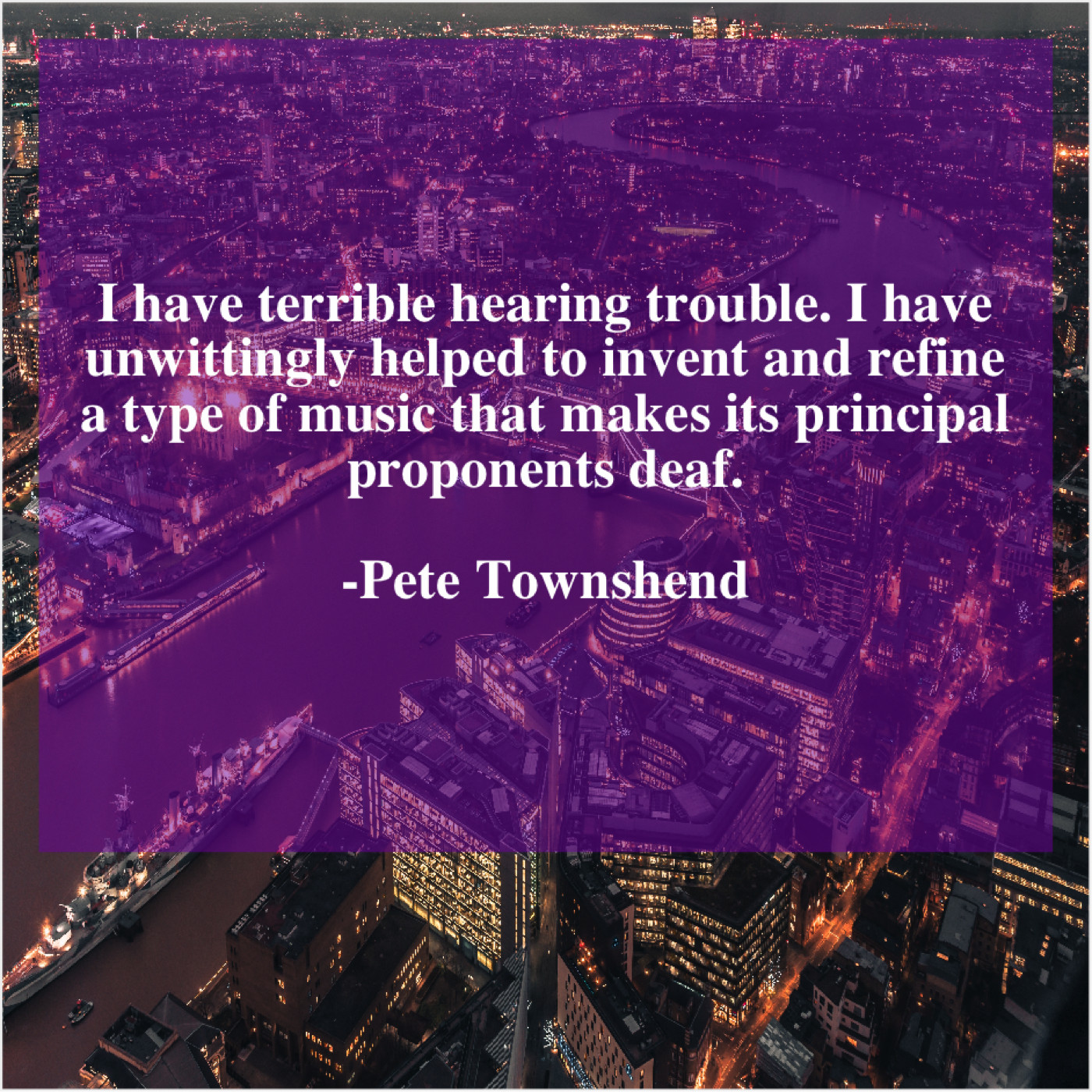 Pete Townshend Pete Townshend – I have terrible hearing trouble… September 16, 2019 admin “I have terrible hearing trouble. I have unwittingly helped to invent and refine a type of music that makes its principal proponents deaf.”-Pete Townshend