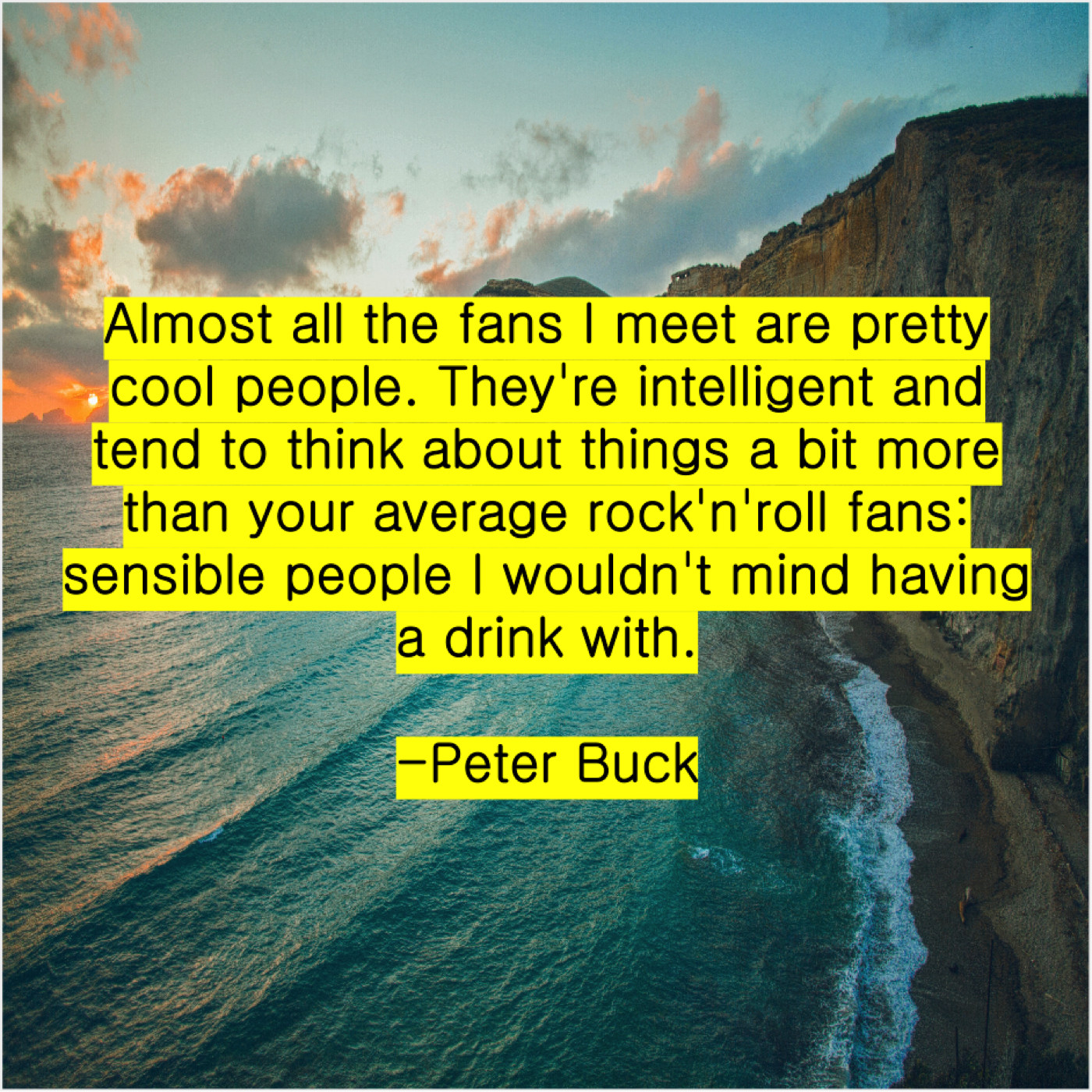 Peter Buck Peter Buck – Almost all the fans I… October 1, 2019 admin “Almost all the fans I meet are pretty cool people. They’re intelligent and tend to think about things a bit more than your average rock’n’roll fans: sensible people I wouldn’t mind having a drink with.”-Peter Buck