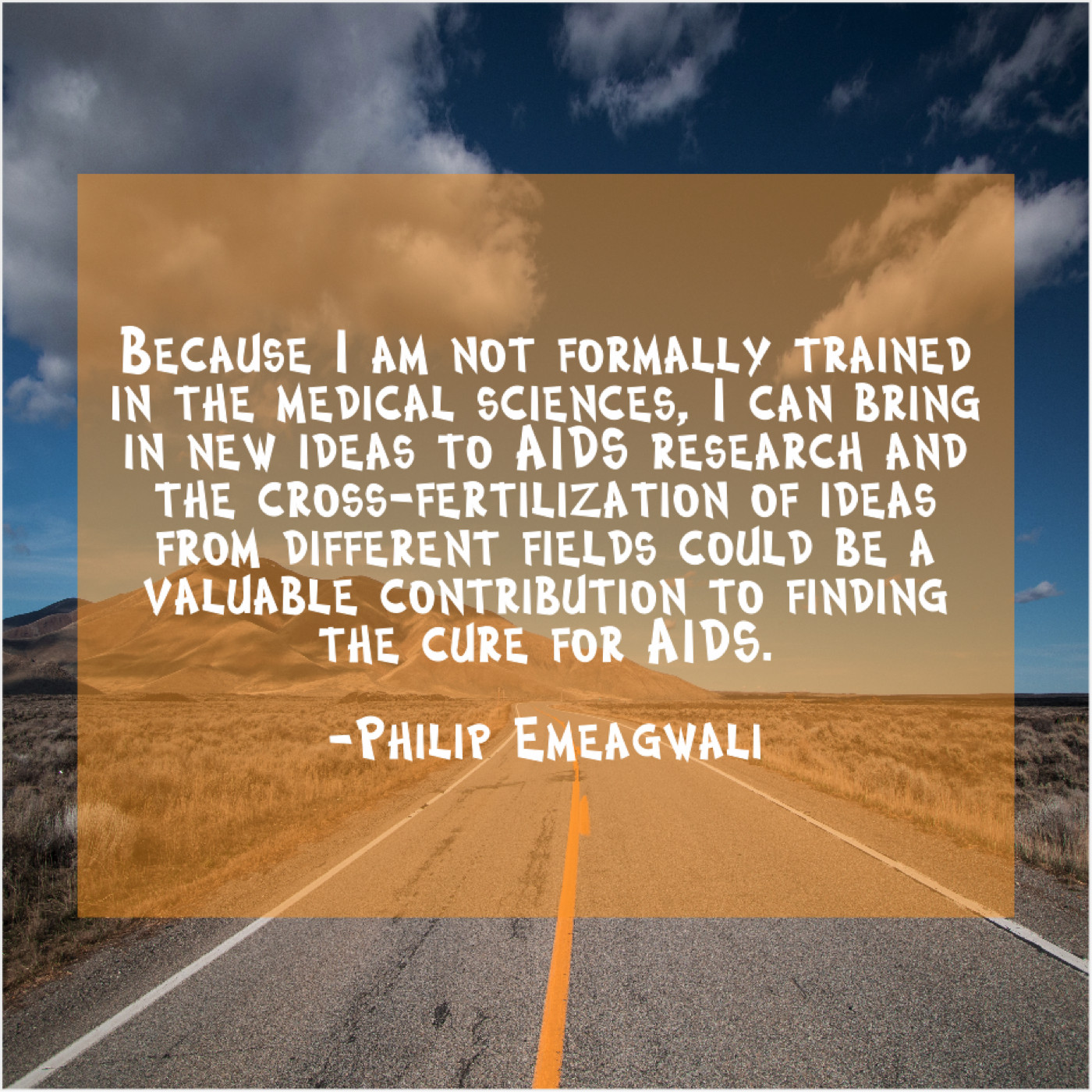 Philip Emeagwali Philip Emeagwali – Because I am not formally… April 2, 2019 admin “Because I am not formally trained in the medical sciences, I can bring in new ideas to AIDS research and the cross-fertilization of ideas from different fields could be a valuable contribution to finding the cure for AIDS.”-Philip Emeagwali