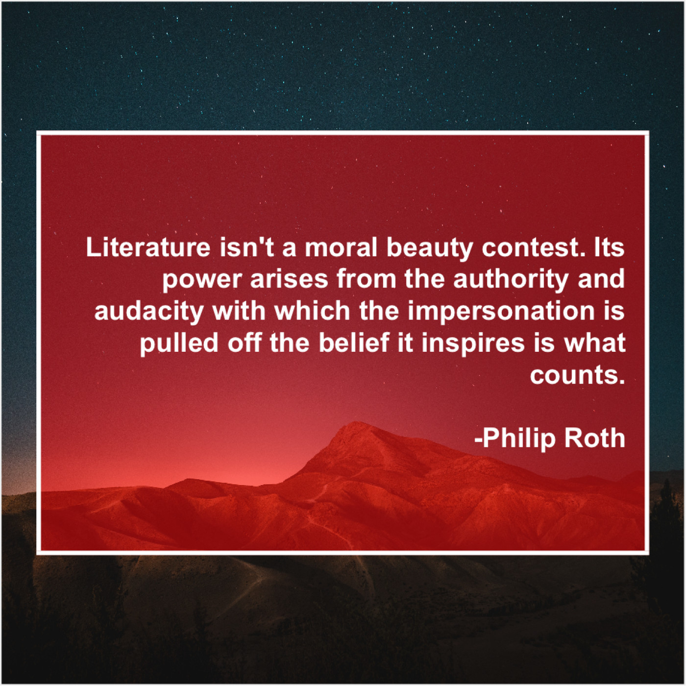 Philip Roth Philip Roth – Literature isn’t a moral beauty… December 4, 2018 admin “Literature isn’t a moral beauty contest. Its power arises from the authority and audacity with which the impersonation is pulled off the belief it inspires is what counts.”-Philip Roth