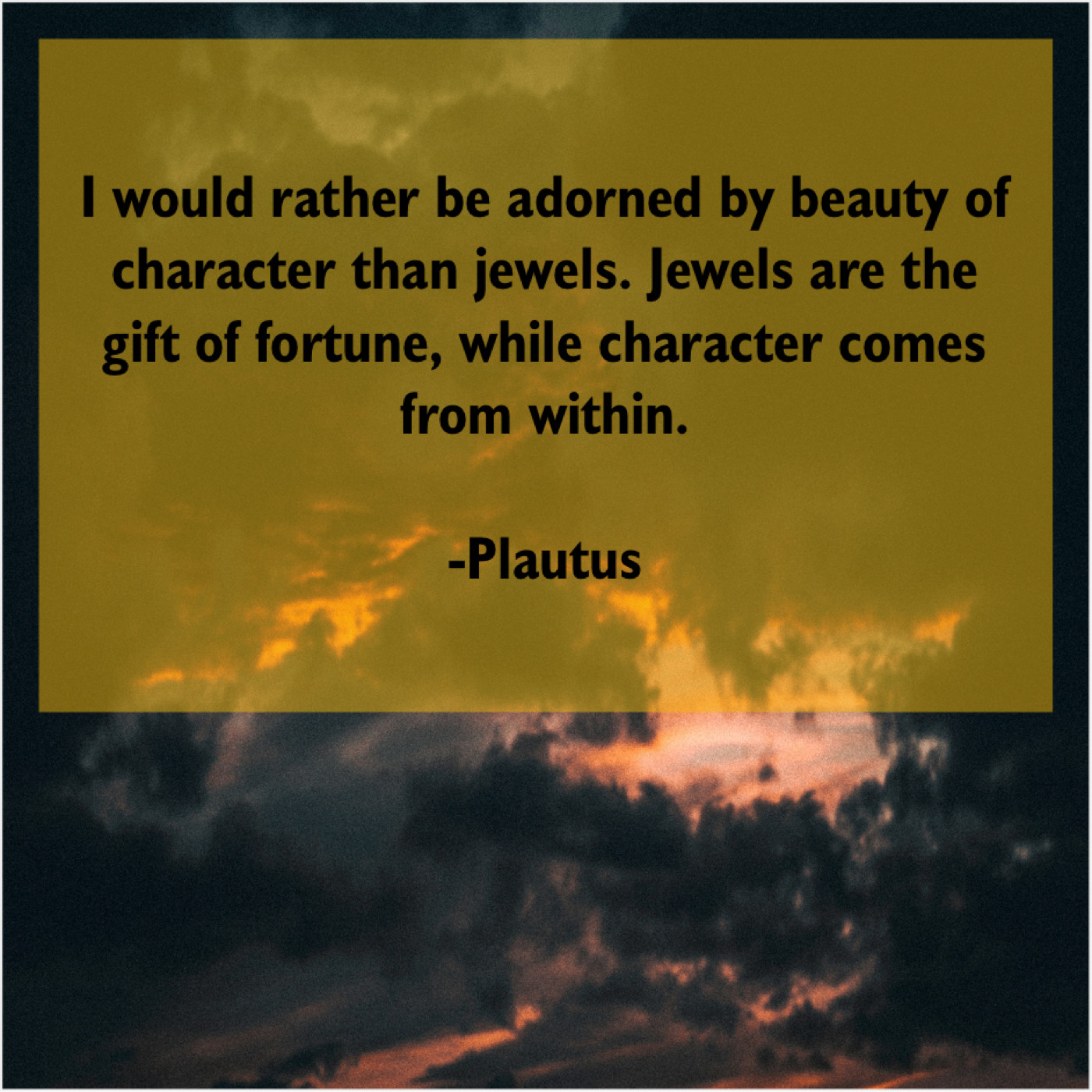 Plautus Plautus – I would rather be adorned… January 15, 2019 admin “I would rather be adorned by beauty of character than jewels. Jewels are the gift of fortune, while character comes from within.”-Plautus