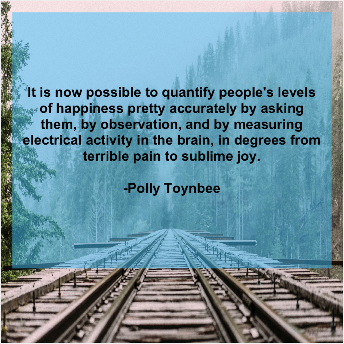 Polly Toynbee Polly Toynbee – It is now possible to… August 11, 2019 admin “It is now possible to quantify people’s levels of happiness pretty accurately by asking them, by observation, and by measuring electrical activity in the brain, in degrees from terrible pain to sublime joy.”-Polly Toynbee