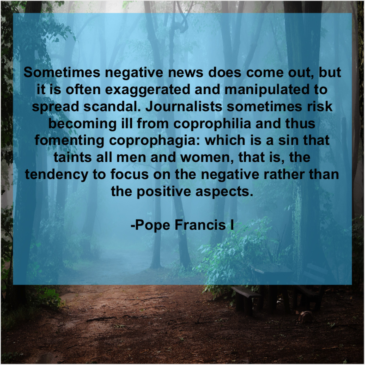 “Sometimes negative news does come out, but it is often exaggerated and manipulated to spread scandal. Journalists sometimes risk becoming ill from coprophilia and thus fomenting coprophagia: which is a sin that taints all men and women, that is, the tendency to focus on the negative rather than the positive aspects.”