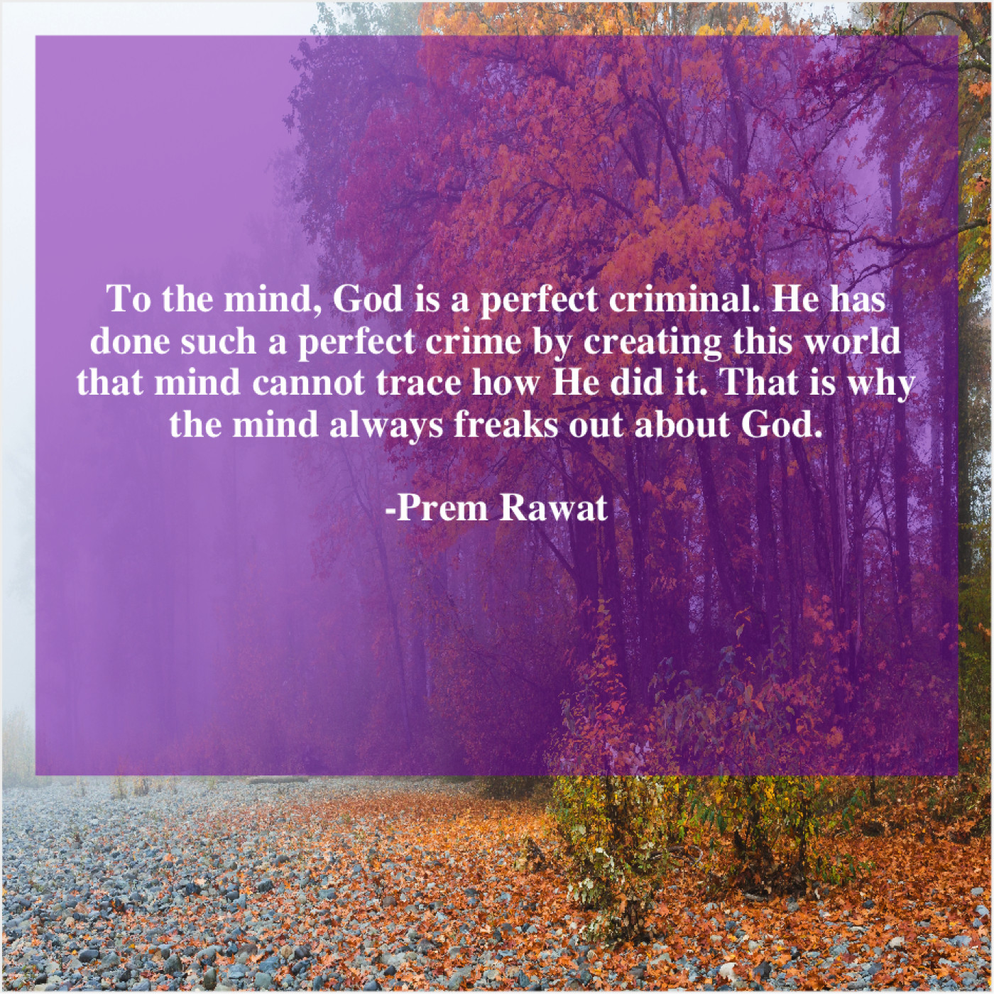 Prem Rawat Prem Rawat – To the mind, God is… May 10, 2019 admin “To the mind, God is a perfect criminal. He has done such a perfect crime by creating this world that mind cannot trace how He did it. That is why the mind always freaks out about God.”-Prem Rawat