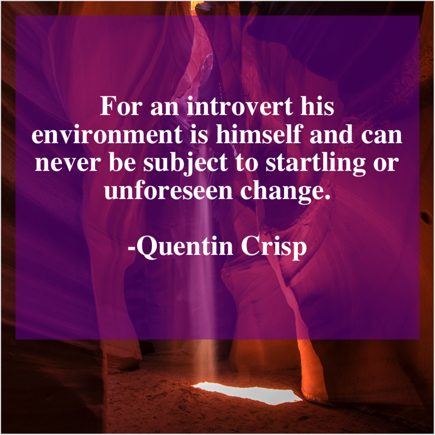 Quentin Crisp Quentin Crisp – For an introvert his environment… March 18, 2019 admin “For an introvert his environment is himself and can never be subject to startling or unforeseen change.”-Quentin Crisp
