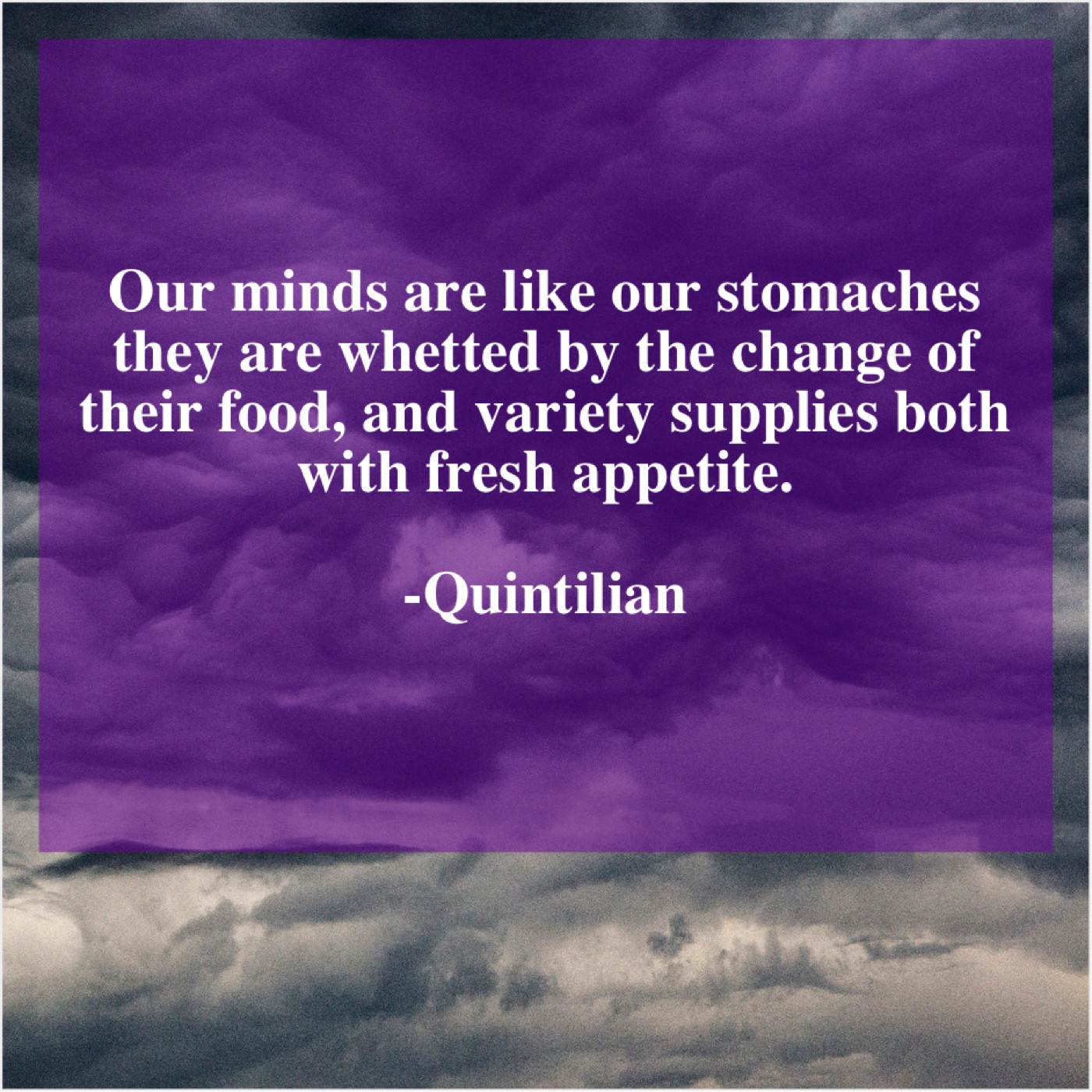 Quintilian Quintilian – Our minds are like our… September 26, 2019 admin “Our minds are like our stomaches they are whetted by the change of their food, and variety supplies both with fresh appetite.”-Quintilian
