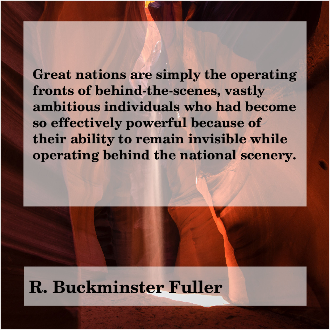 “Great nations are simply the operating fronts of behind-the-scenes, vastly ambitious individuals who had become so effectively powerful because of their ability to remain invisible while operating behind the national scenery.” -R. Buckminster Fuller