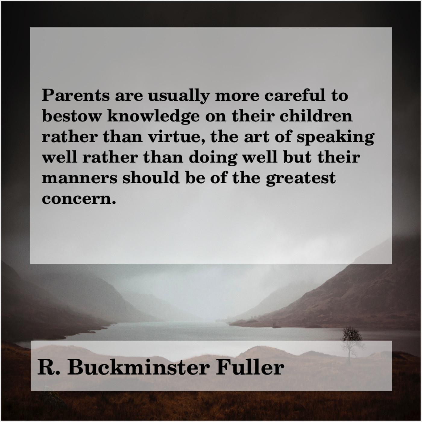 R. Buckminster Fuller R. Buckminster Fuller – Parents are usually more careful… January 19, 2019 admin “Parents are usually more careful to bestow knowledge on their children rather than virtue, the art of speaking well rather than doing well but their manners should be of the greatest concern.”-R. Buckminster Fuller