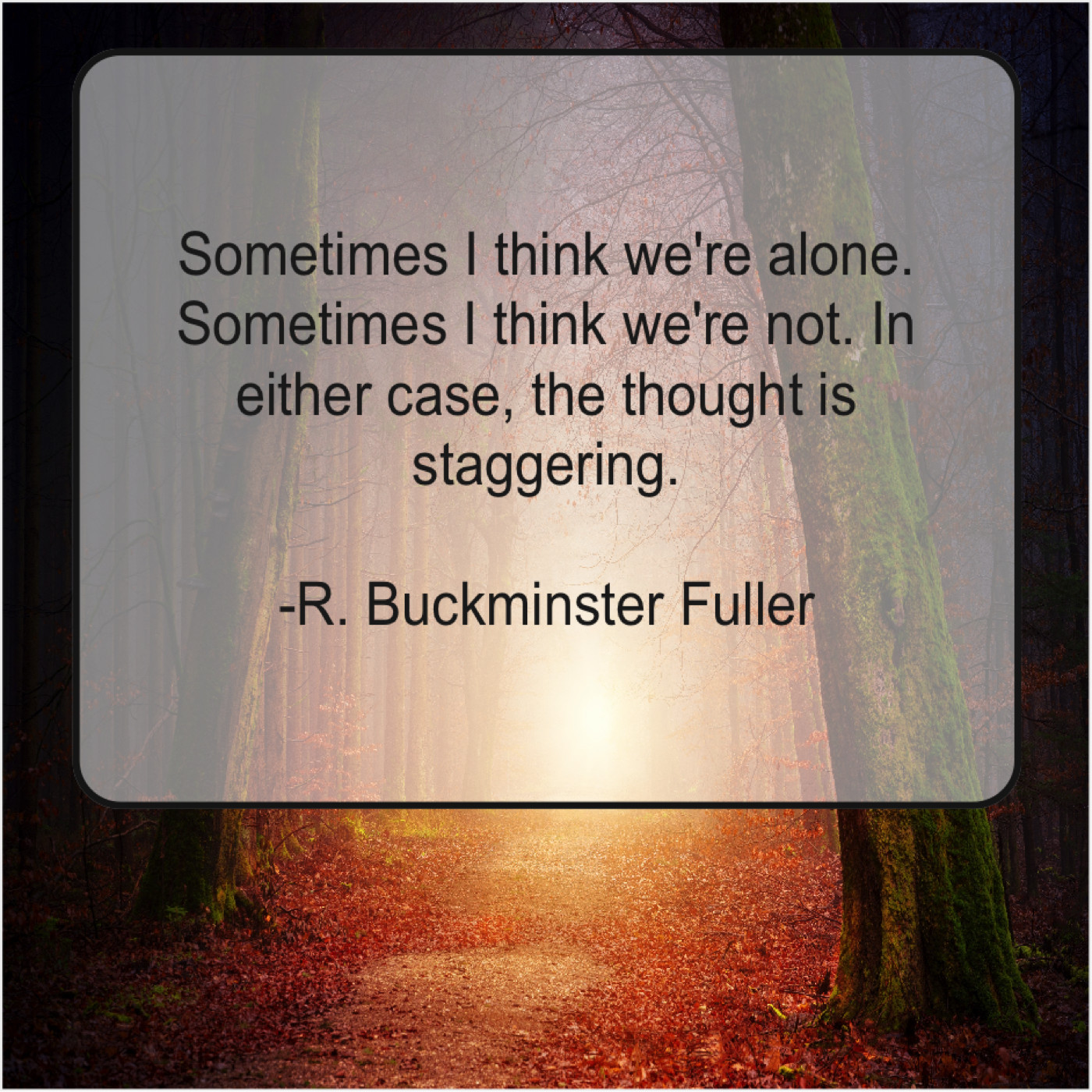 R. Buckminster Fuller R. Buckminster Fuller – Sometimes I think we’re alone… March 28, 2019 admin “Sometimes I think we’re alone. Sometimes I think we’re not. In either case, the thought is staggering.”-R. Buckminster Fuller