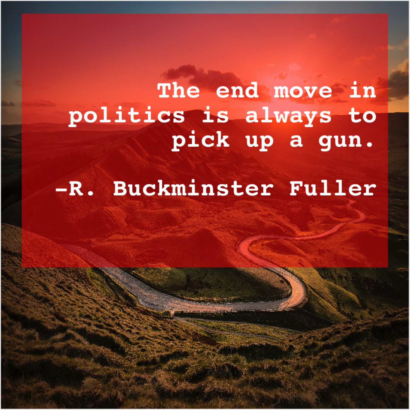 R. Buckminster Fuller R. Buckminster Fuller – The end move in politics… December 28, 2018 admin “The end move in politics is always to pick up a gun.”-R. Buckminster Fuller