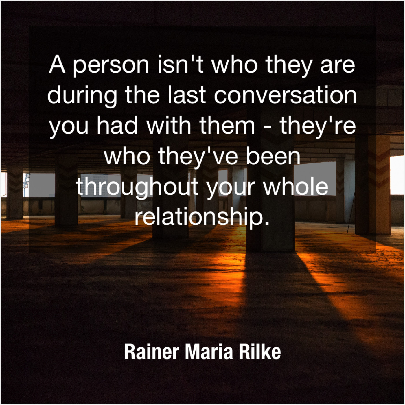 Rainer Maria Rilke Rainer Maria Rilke – A person isn’t who they… August 3, 2019 admin “A person isn’t who they are during the last conversation you had with them – they’re who they’ve been throughout your whole relationship.”-Rainer Maria Rilke