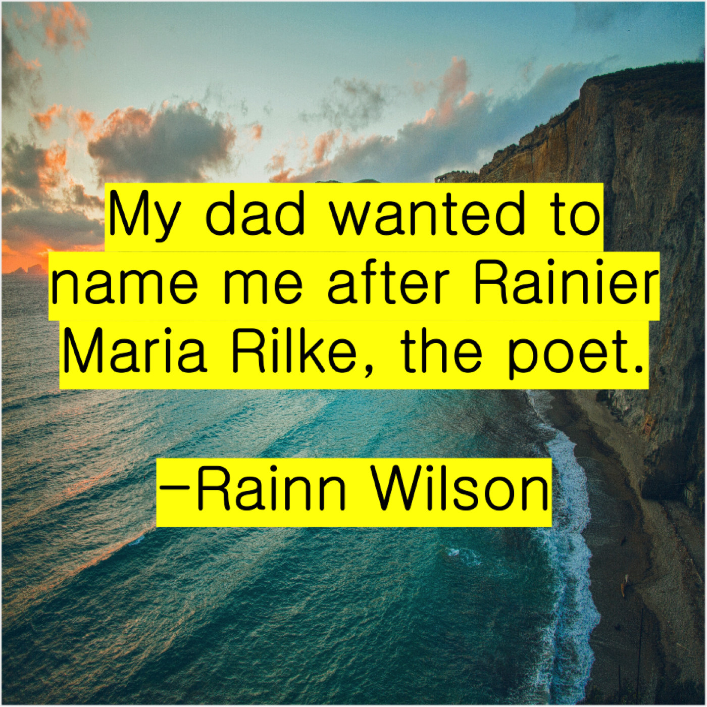 Rainn Wilson Rainn Wilson – My dad wanted to name… September 23, 2019 admin “My dad wanted to name me after Rainier Maria Rilke, the poet.”-Rainn Wilson