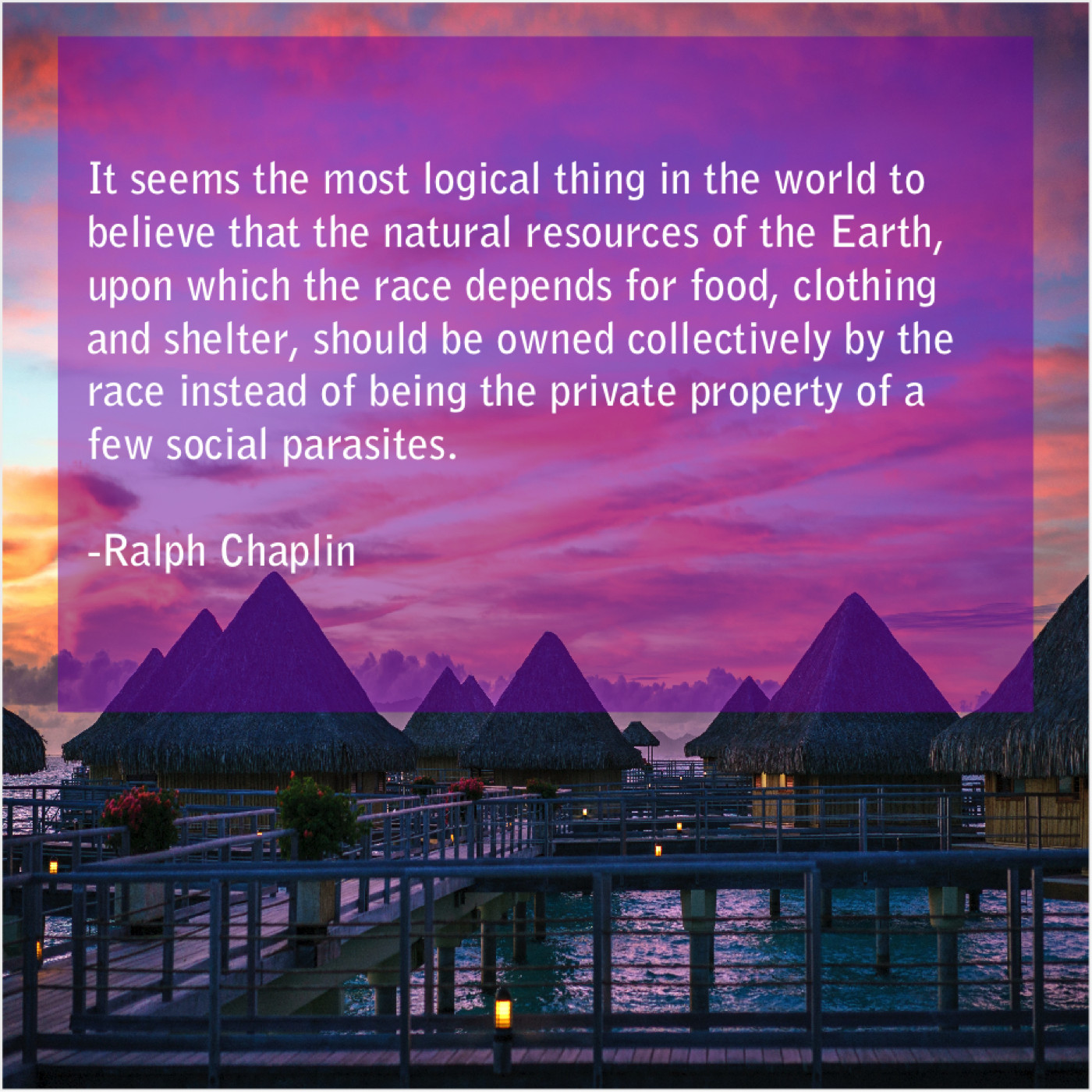 “It seems the most logical thing in the world to believe that the natural resources of the Earth, upon which the race depends for food, clothing and shelter, should be owned collectively by the race instead of being the private property of a few social parasites.”