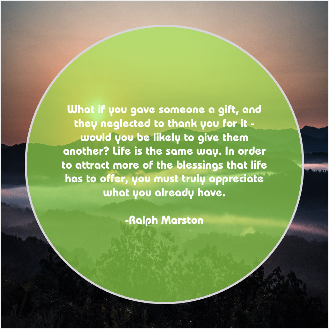 “What if you gave someone a gift, and they neglected to thank you for it – would you be likely to give them another? Life is the same way. In order to attract more of the blessings that life has to offer, you must truly appreciate what you already have.”