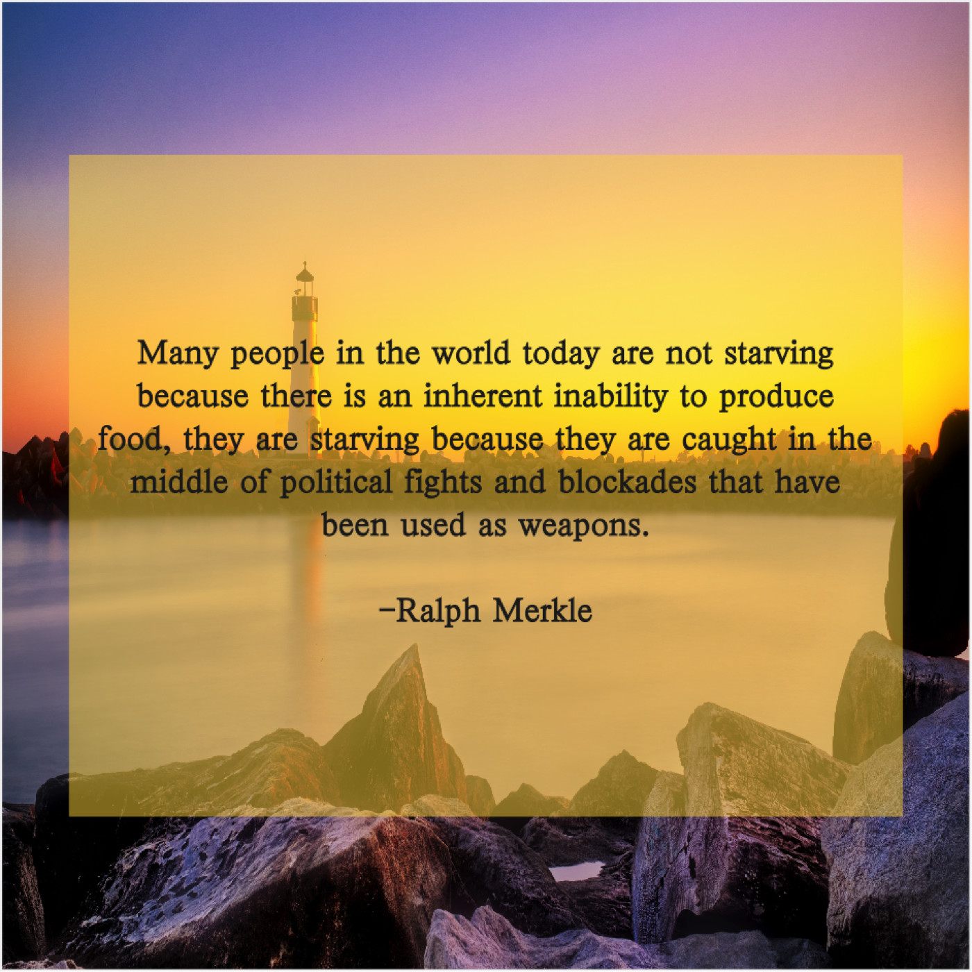 Ralph Merkle Ralph Merkle – Many people in the world… July 4, 2019 admin “Many people in the world today are not starving because there is an inherent inability to produce food, they are starving because they are caught in the middle of political fights and blockades that have been used as weapons.”-Ralph Merkle