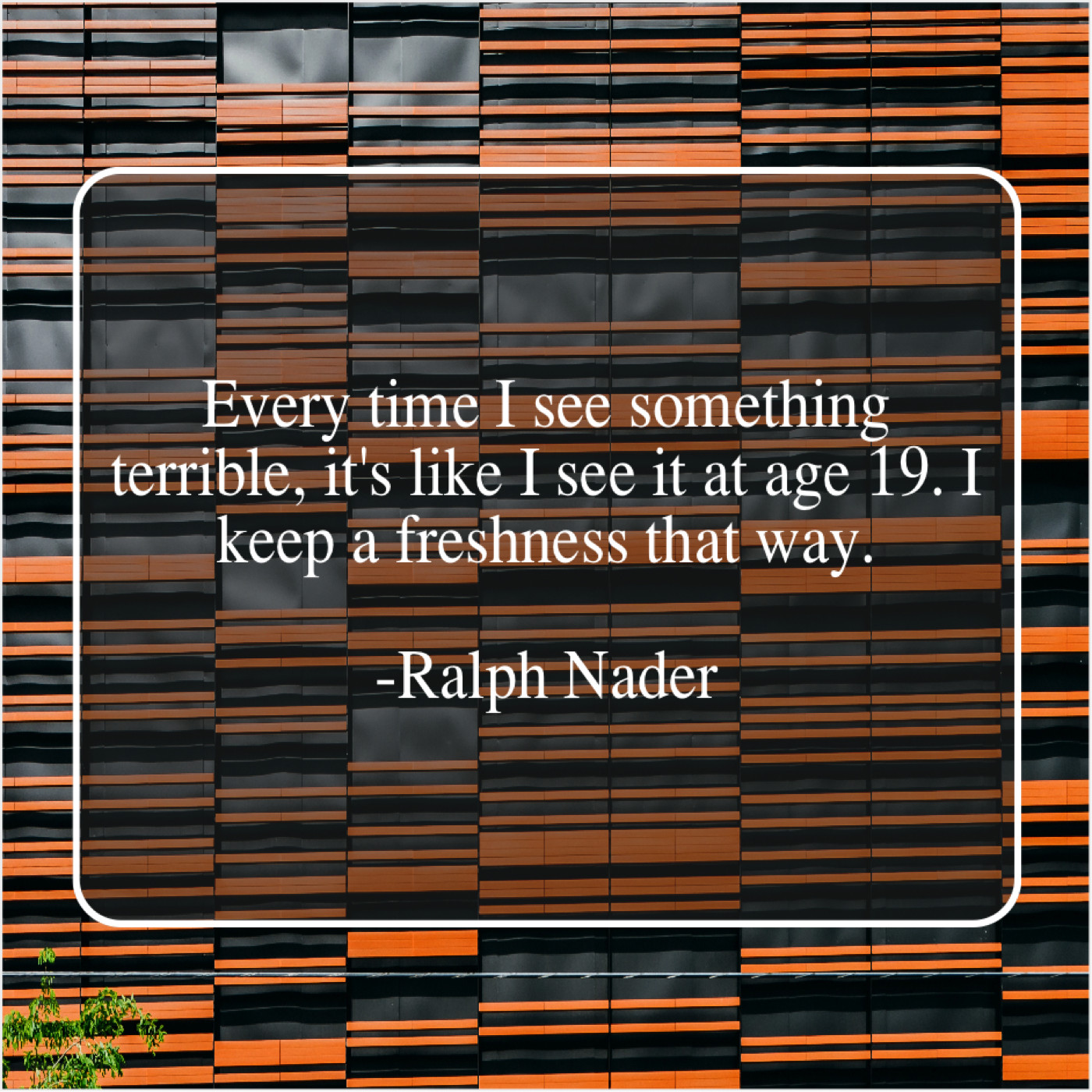 Ralph Nader Ralph Nader – Every time I see something… June 29, 2019 admin “Every time I see something terrible, it’s like I see it at age 19. I keep a freshness that way.”-Ralph Nader