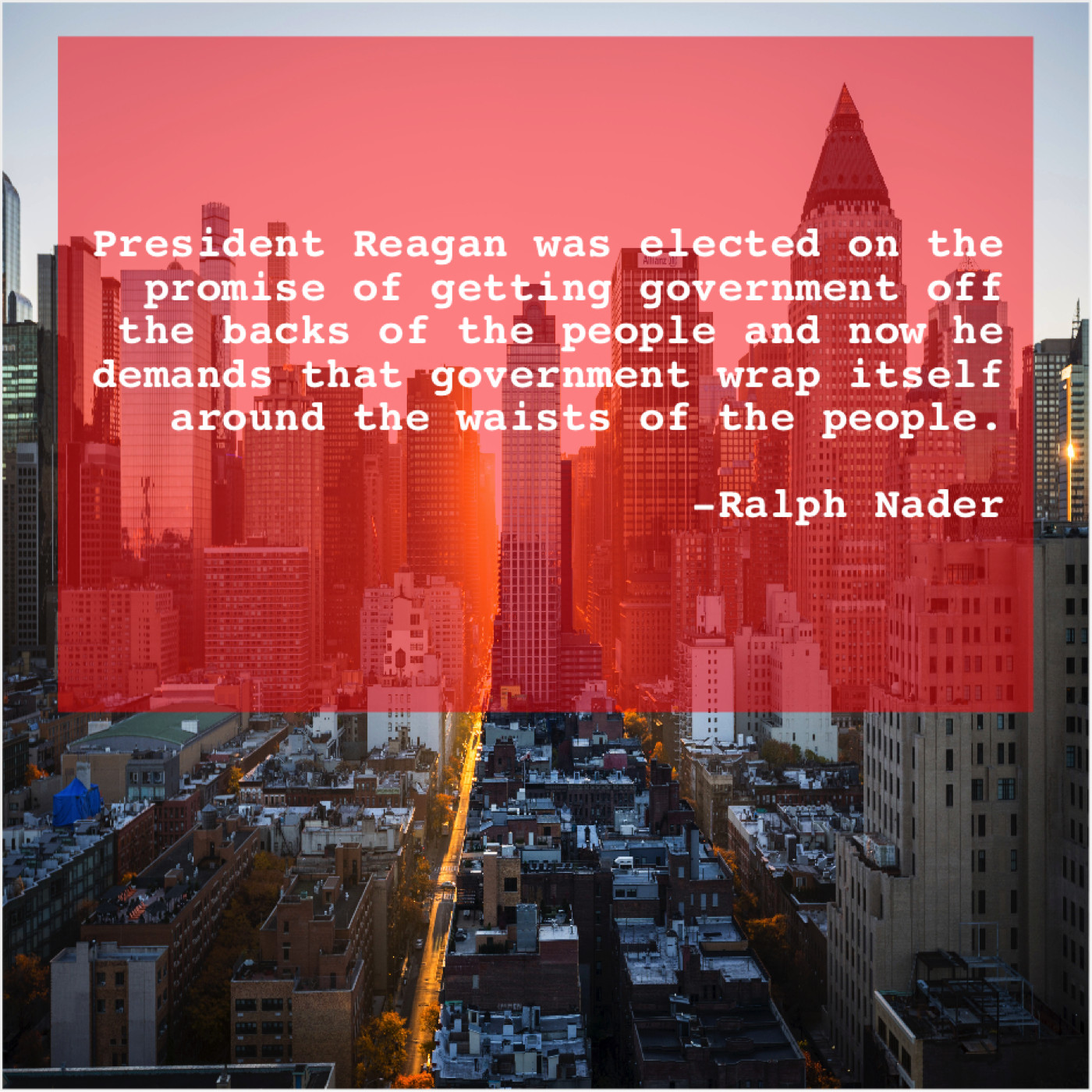 Ralph Nader Ralph Nader – President Reagan was elected on… July 15, 2019 admin “President Reagan was elected on the promise of getting government off the backs of the people and now he demands that government wrap itself around the waists of the people.”-Ralph Nader