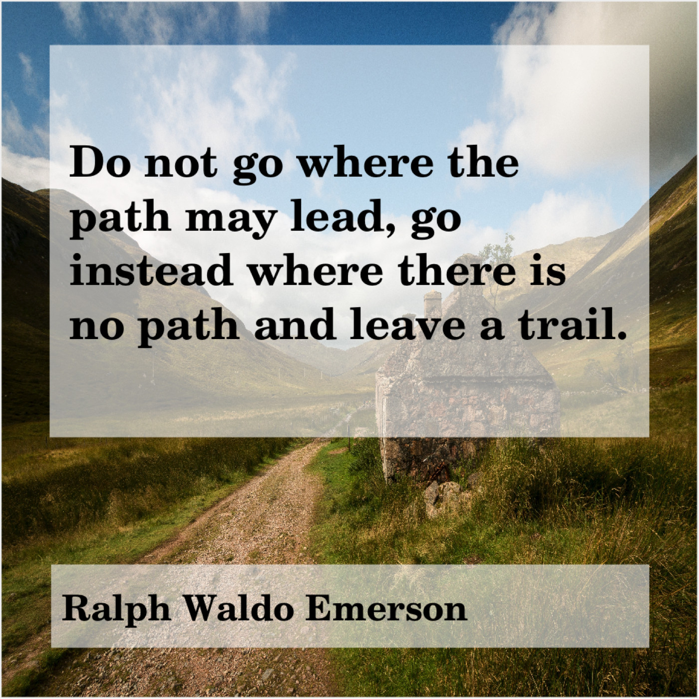 Ralph Waldo Emerson Ralph Waldo Emerson – Do not go where the… December 18, 2018 admin “Do not go where the path may lead, go instead where there is no path and leave a trail.”-Ralph Waldo Emerson