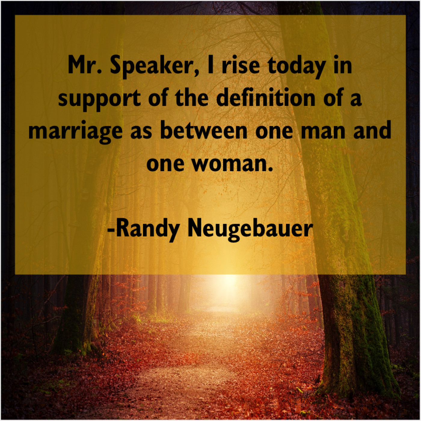 Randy Neugebauer Randy Neugebauer – Mr. Speaker, I rise today… January 31, 2019 admin “Mr. Speaker, I rise today in support of the definition of a marriage as between one man and one woman.”-Randy Neugebauer