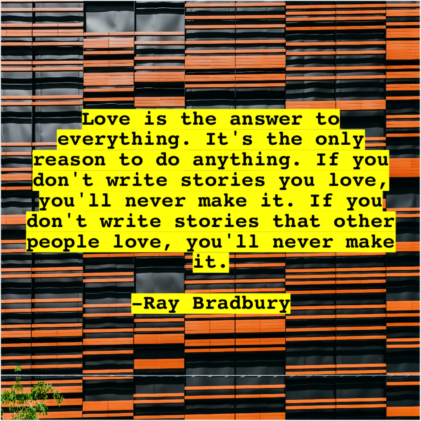 Ray Bradbury Ray Bradbury – Love is the answer to… August 12, 2019 admin “Love is the answer to everything. It’s the only reason to do anything. If you don’t write stories you love, you’ll never make it. If you don’t write stories that other people love, you’ll never make it.”-Ray Bradbury