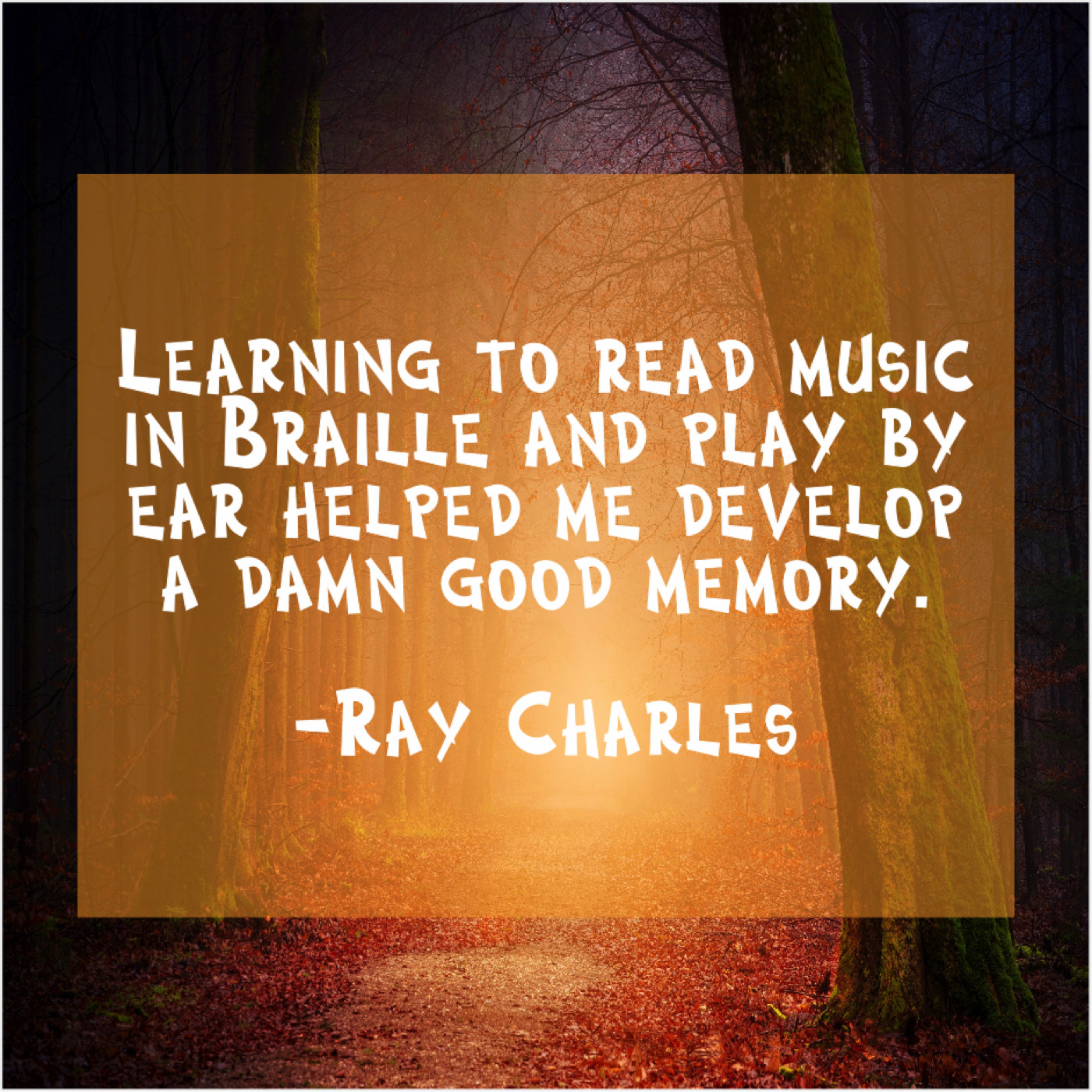 Ray Charles Ray Charles – Learning to read music in… September 2, 2019 admin “Learning to read music in Braille and play by ear helped me develop a damn good memory.”-Ray Charles