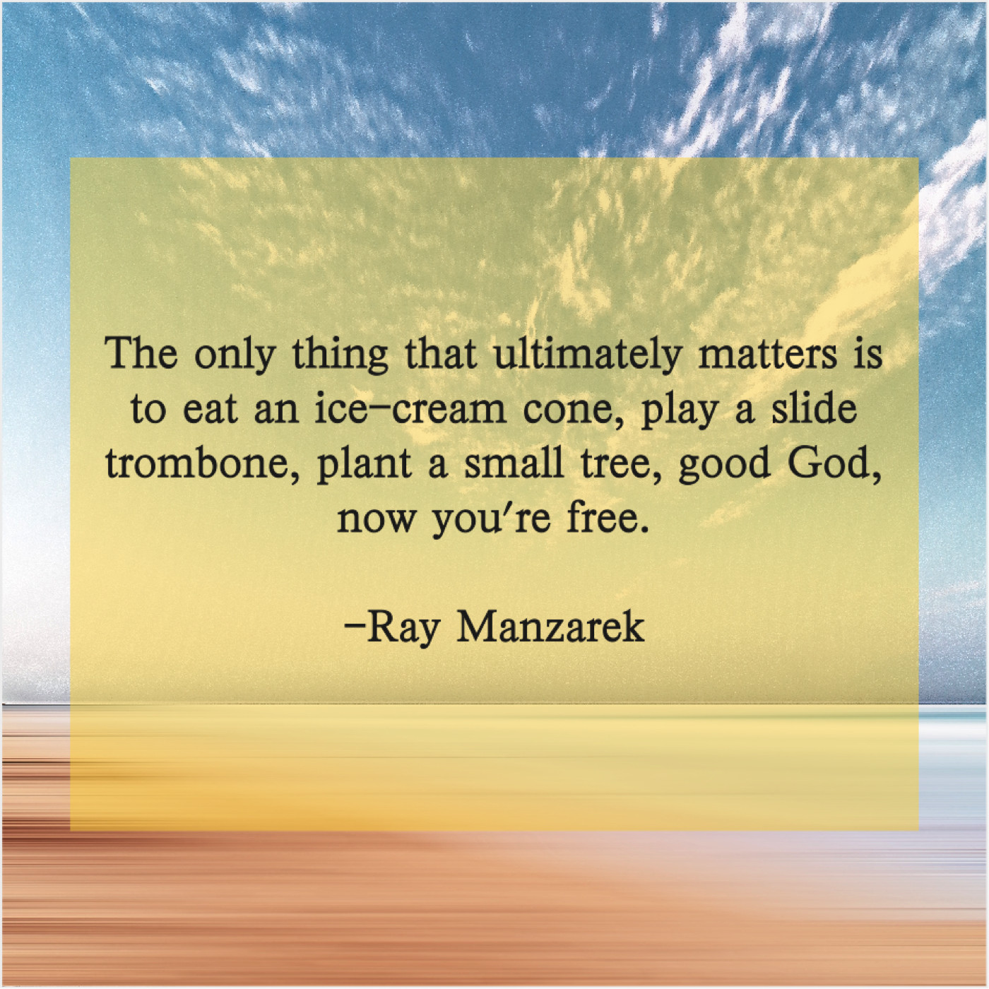 Ray Manzarek Ray Manzarek – The only thing that ultimately… June 11, 2019 admin “The only thing that ultimately matters is to eat an ice-cream cone, play a slide trombone, plant a small tree, good God, now you’re free.”-Ray Manzarek