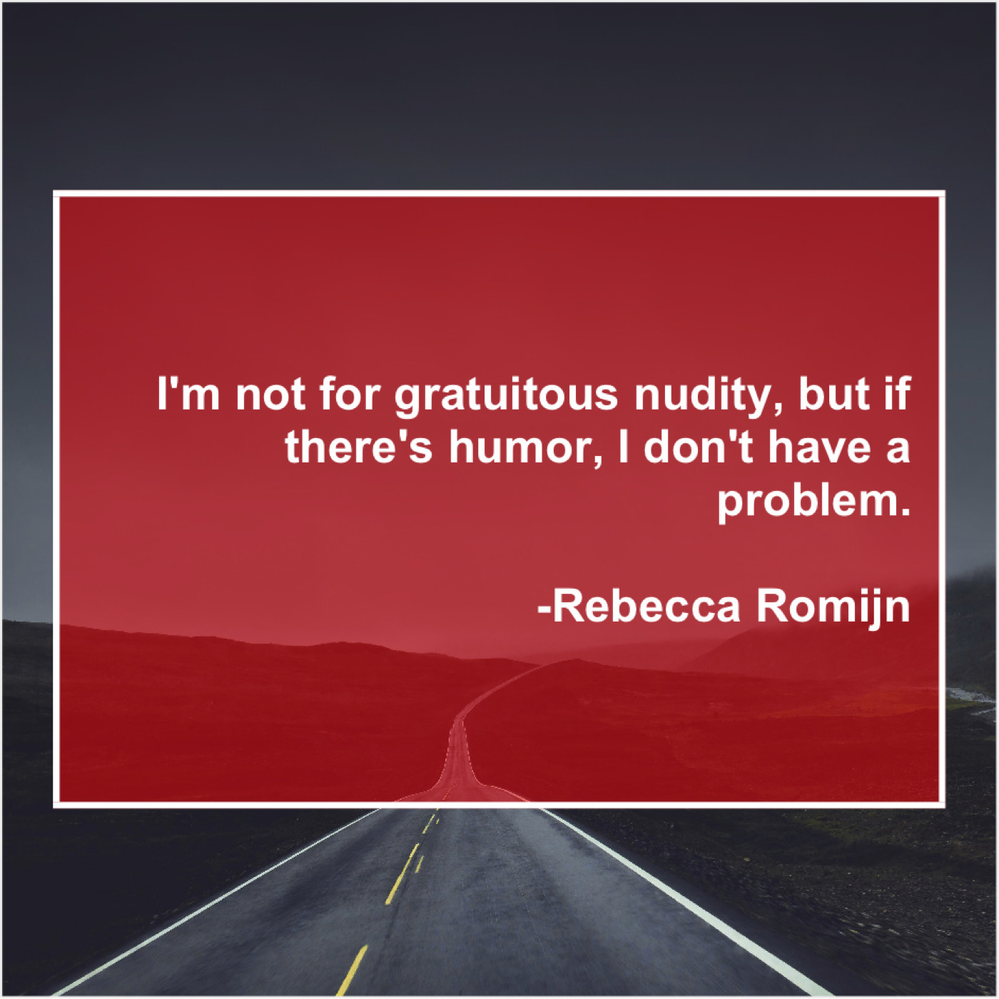 Rebecca Romijn Rebecca Romijn – I’m not for gratuitous nudity… October 30, 2018 admin “I’m not for gratuitous nudity, but if there’s humor, I don’t have a problem.”-Rebecca Romijn