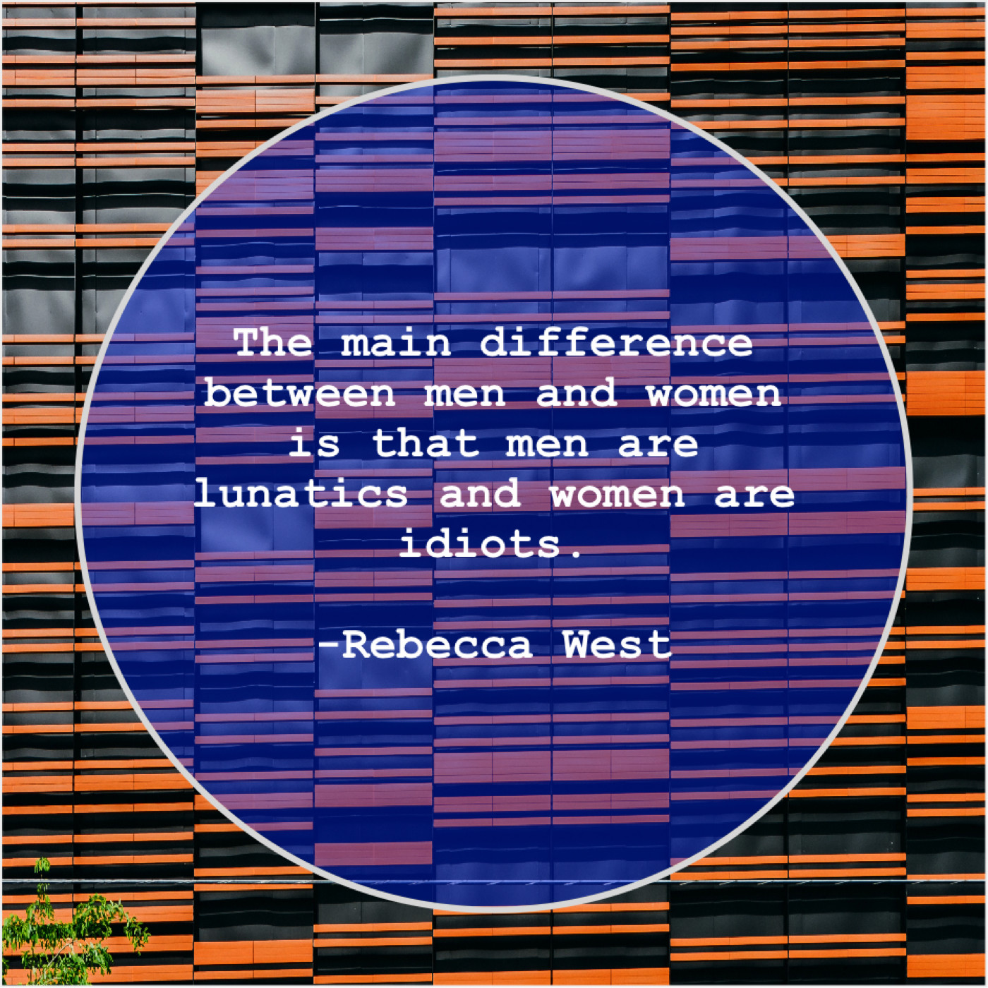 Rebecca West Rebecca West – The main difference between men… May 2, 2019 admin “The main difference between men and women is that men are lunatics and women are idiots.”-Rebecca West