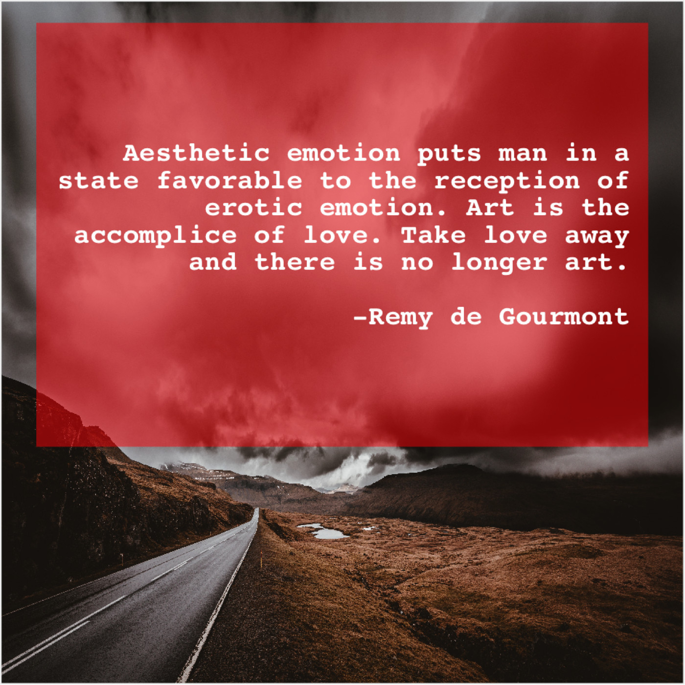Remy de Gourmont Remy de Gourmont – Aesthetic emotion puts man in… January 18, 2019 admin “Aesthetic emotion puts man in a state favorable to the reception of erotic emotion. Art is the accomplice of love. Take love away and there is no longer art.”-Remy de Gourmont
