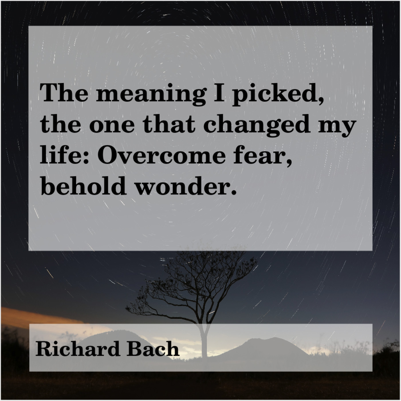 Richard Bach Richard Bach – The meaning I picked, the… August 3, 2019 admin “The meaning I picked, the one that changed my life: Overcome fear, behold wonder.”-Richard Bach