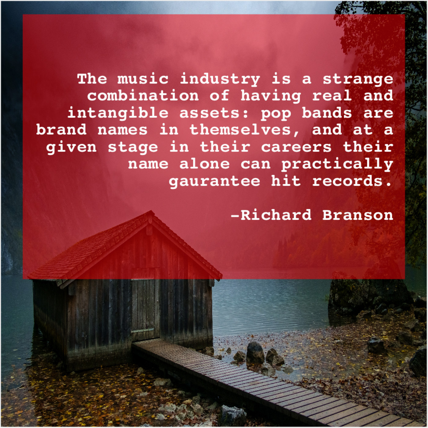 Richard Branson Richard Branson – The music industry is a… September 9, 2019 admin “The music industry is a strange combination of having real and intangible assets: pop bands are brand names in themselves, and at a given stage in their careers their name alone can practically gaurantee hit records.”-Richard Branson
