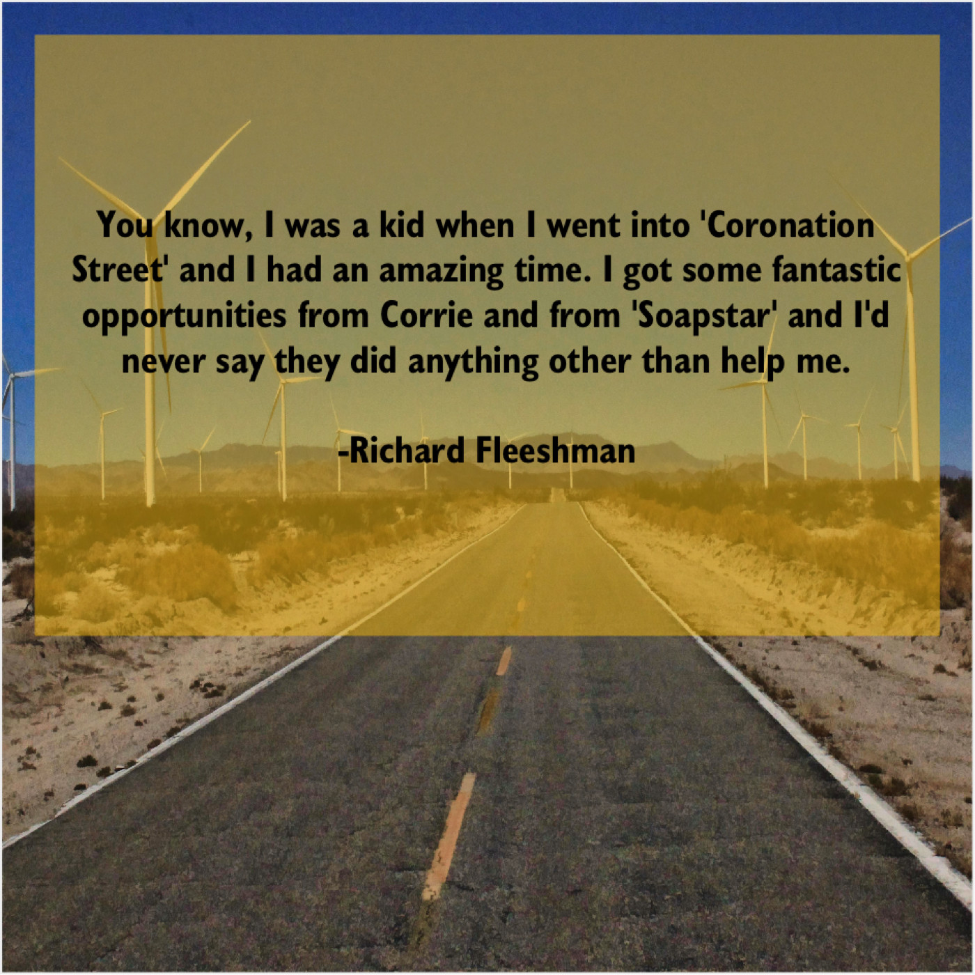Richard Fleeshman Richard Fleeshman – You know, I was a… August 21, 2019 admin “You know, I was a kid when I went into ‘Coronation Street’ and I had an amazing time. I got some fantastic opportunities from Corrie and from ‘Soapstar’ and I’d never say they did anything other than help me.”-Richard Fleeshman