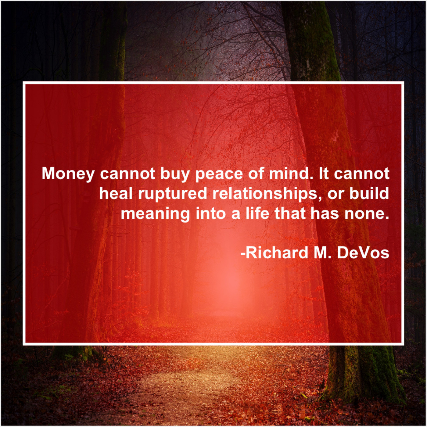 Richard M. DeVos Richard M. DeVos – Money cannot buy peace of… September 15, 2019 admin “Money cannot buy peace of mind. It cannot heal ruptured relationships, or build meaning into a life that has none.”-Richard M. DeVos