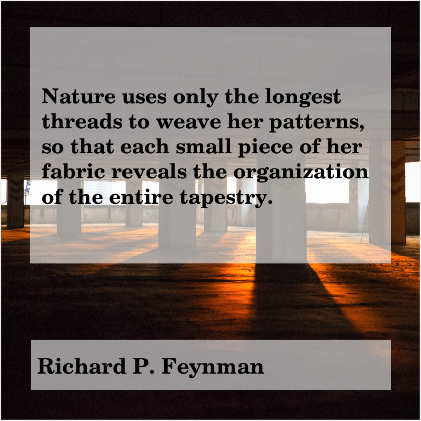 Richard P. Feynman Richard P. Feynman – Nature uses only the longest… April 23, 2019 admin “Nature uses only the longest threads to weave her patterns, so that each small piece of her fabric reveals the organization of the entire tapestry.”-Richard P. Feynman