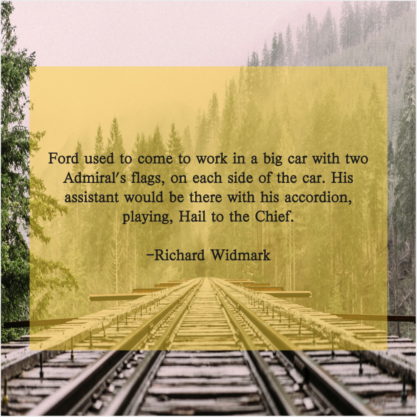 Richard Widmark Richard Widmark – Ford used to come to… October 19, 2019 admin “Ford used to come to work in a big car with two Admiral’s flags, on each side of the car. His assistant would be there with his accordion, playing, Hail to the Chief.”-Richard Widmark