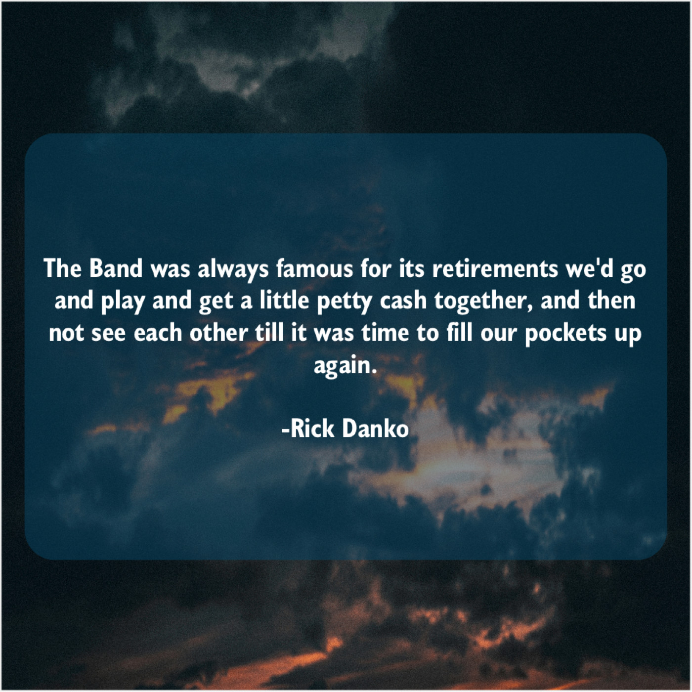 Rick Danko Rick Danko – The Band was always famous… October 10, 2019 admin “The Band was always famous for its retirements we’d go and play and get a little petty cash together, and then not see each other till it was time to fill our pockets up again.”-Rick Danko