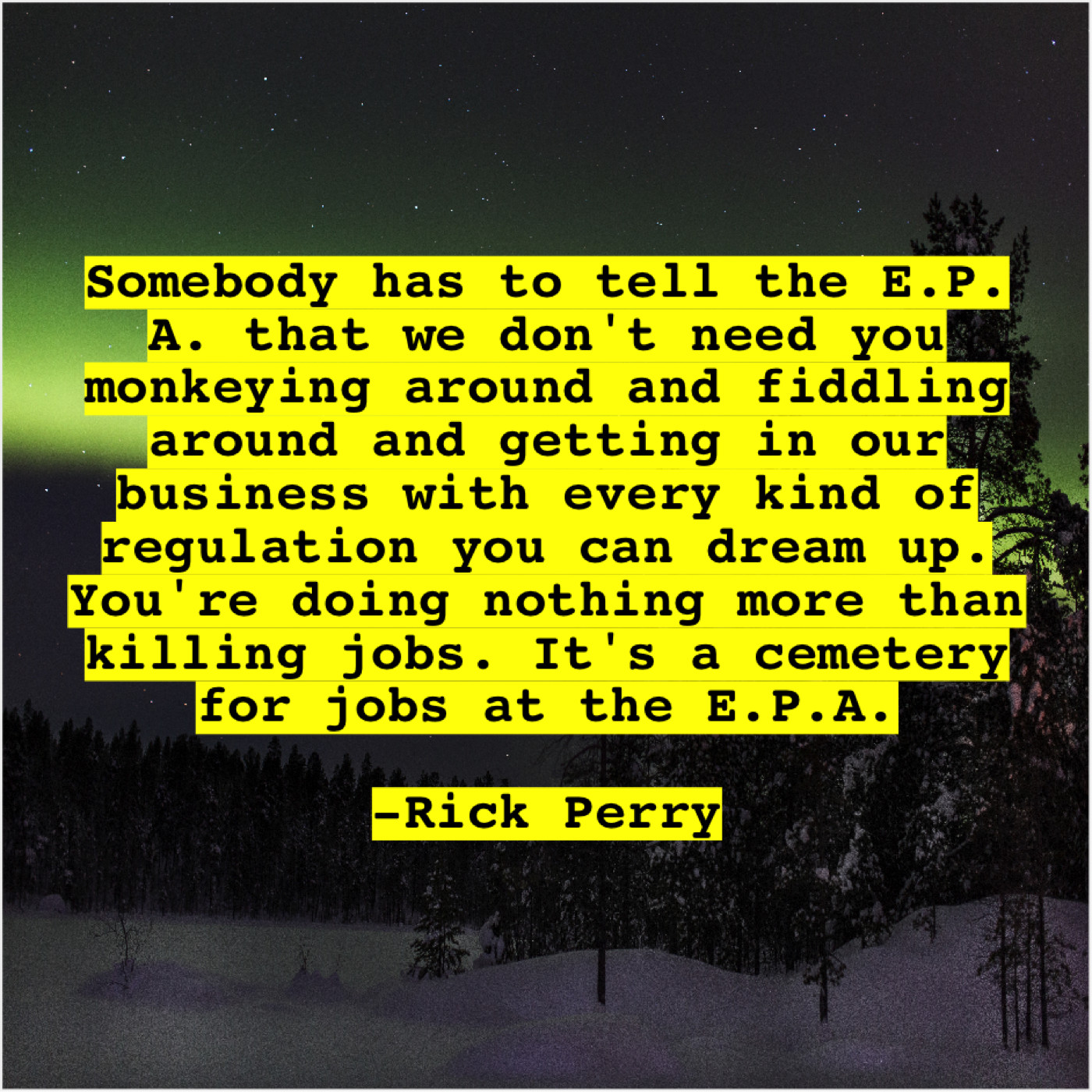 “Somebody has to tell the E.P.A. that we don’t need you monkeying around and fiddling around and getting in our business with every kind of regulation you can dream up. You’re doing nothing more than killing jobs. It’s a cemetery for jobs at the E.P.A.”