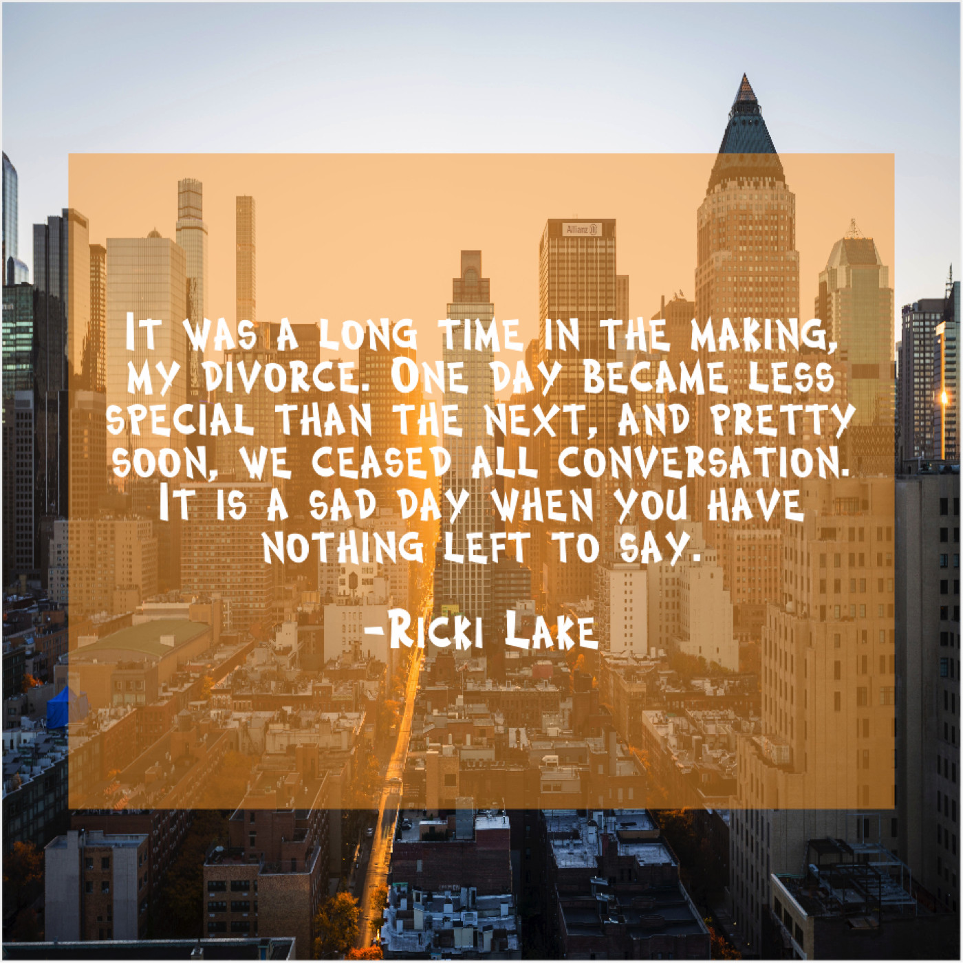 Ricki Lake Ricki Lake – It was a long time… April 19, 2019 admin “It was a long time in the making, my divorce. One day became less special than the next, and pretty soon, we ceased all conversation. It is a sad day when you have nothing left to say.”-Ricki Lake