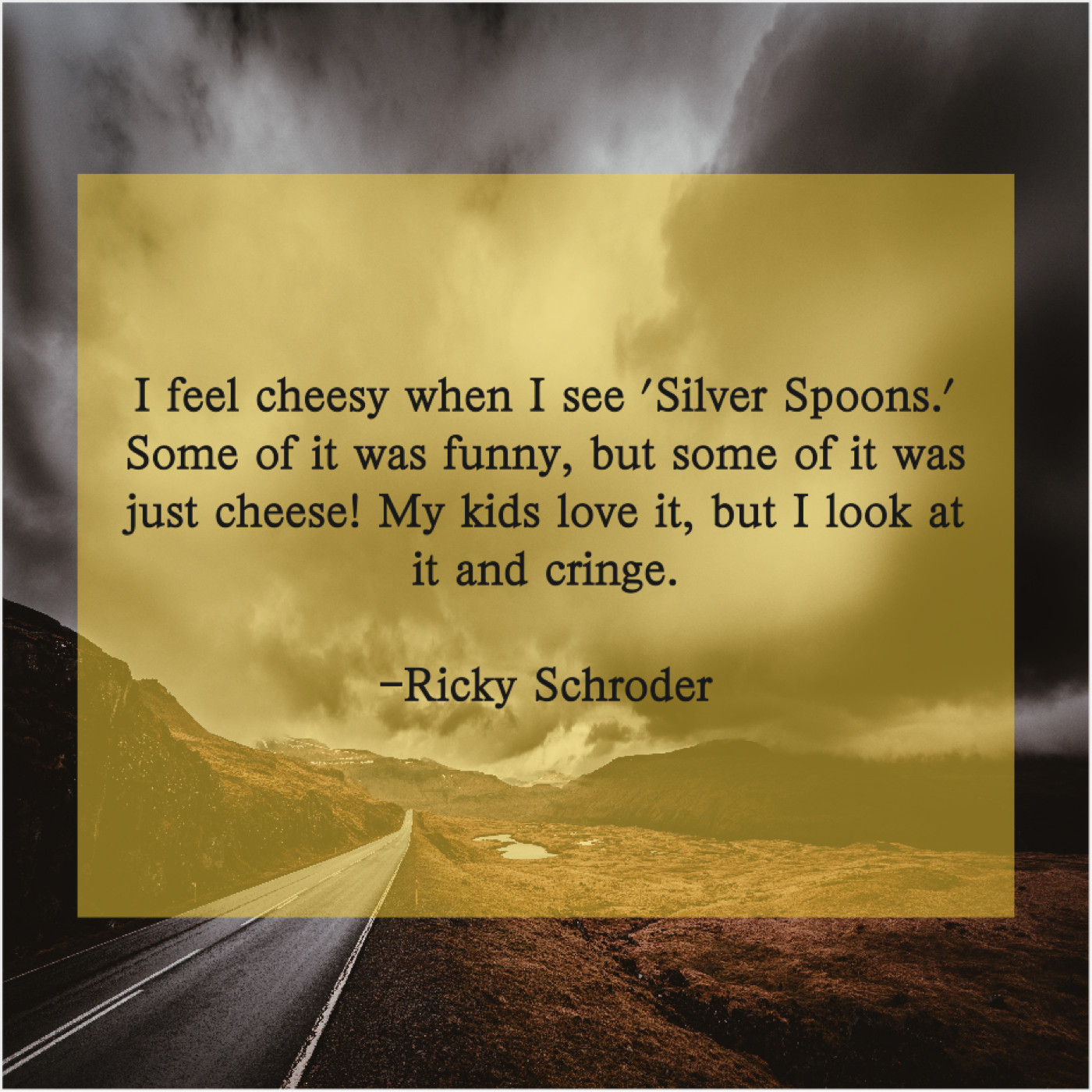 Ricky Schroder Ricky Schroder – I feel cheesy when I… May 18, 2019 admin “I feel cheesy when I see ‘Silver Spoons.’ Some of it was funny, but some of it was just cheese! My kids love it, but I look at it and cringe.”-Ricky Schroder