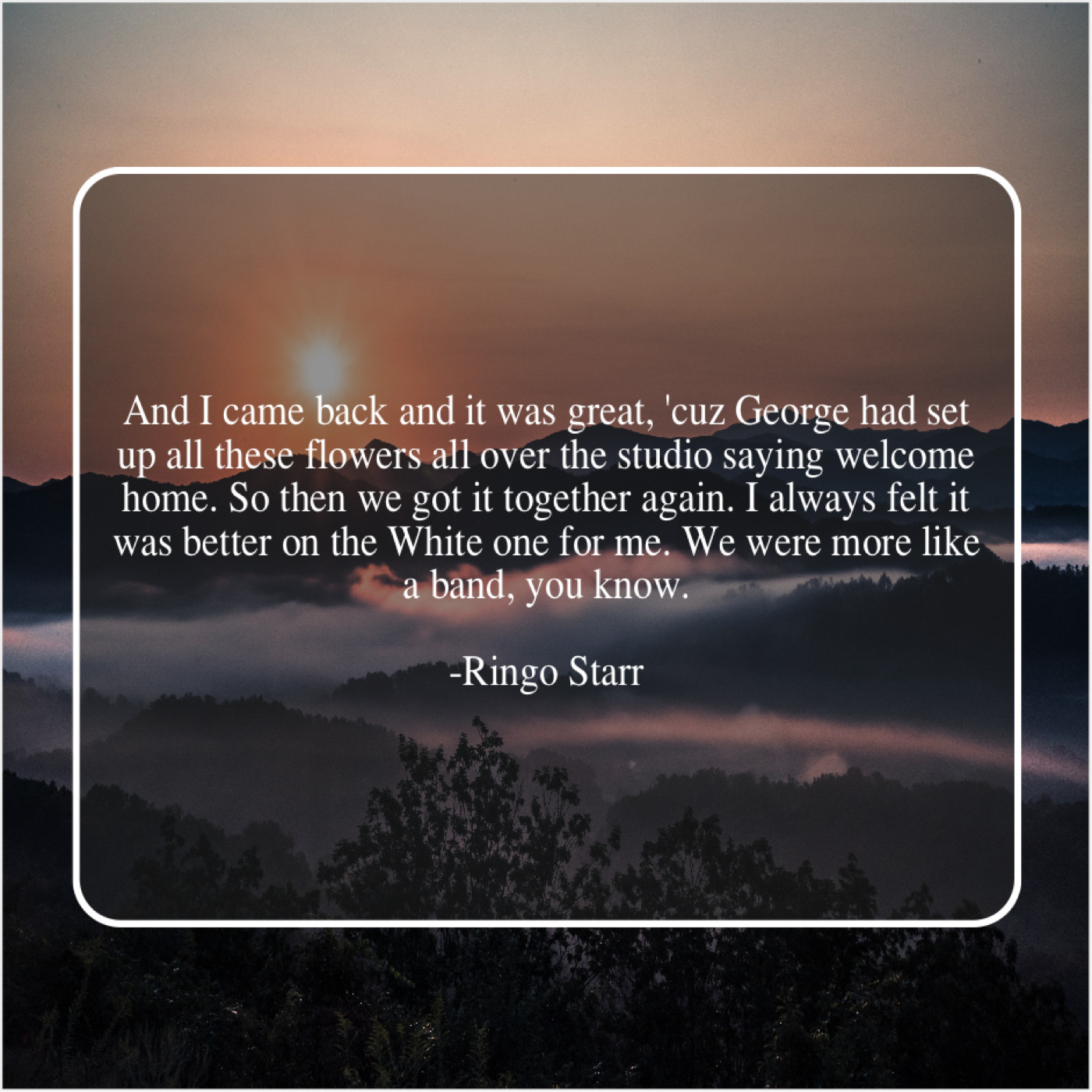“And I came back and it was great, ‘cuz George had set up all these flowers all over the studio saying welcome home. So then we got it together again. I always felt it was better on the White one for me. We were more like a band, you know.”