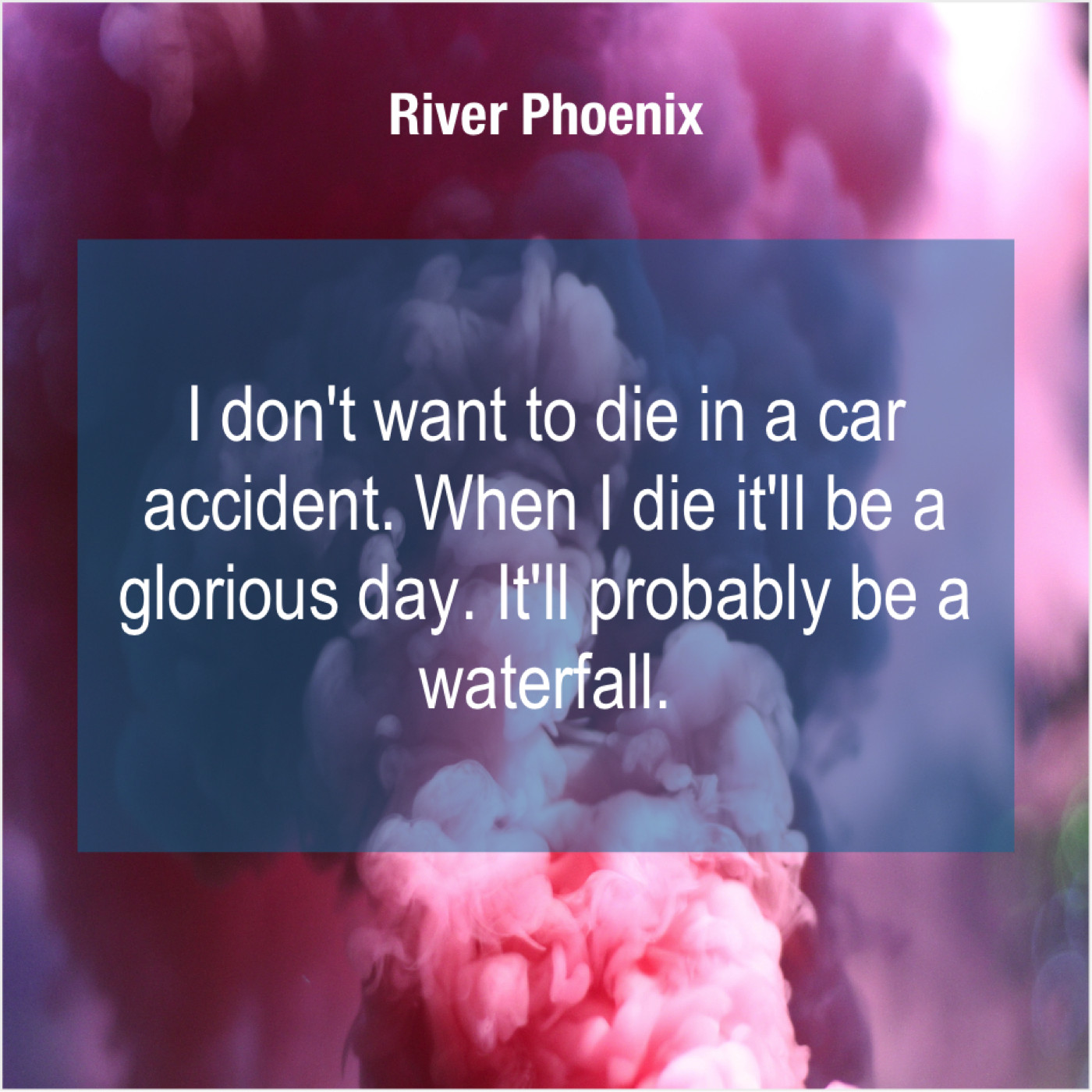 River Phoenix River Phoenix – I don’t want to die… July 31, 2019 admin “I don’t want to die in a car accident. When I die it’ll be a glorious day. It’ll probably be a waterfall.”-River Phoenix