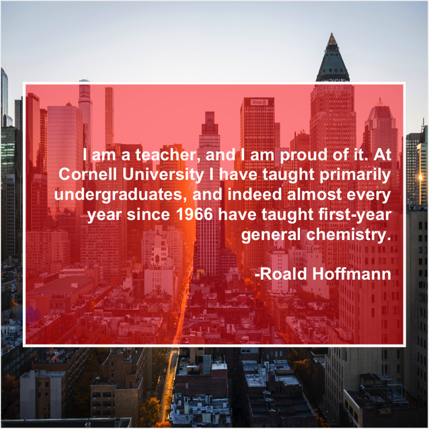 Roald Hoffmann Roald Hoffmann – I am a teacher, and… February 3, 2019 admin “I am a teacher, and I am proud of it. At Cornell University I have taught primarily undergraduates, and indeed almost every year since 1966 have taught first-year general chemistry.”-Roald Hoffmann