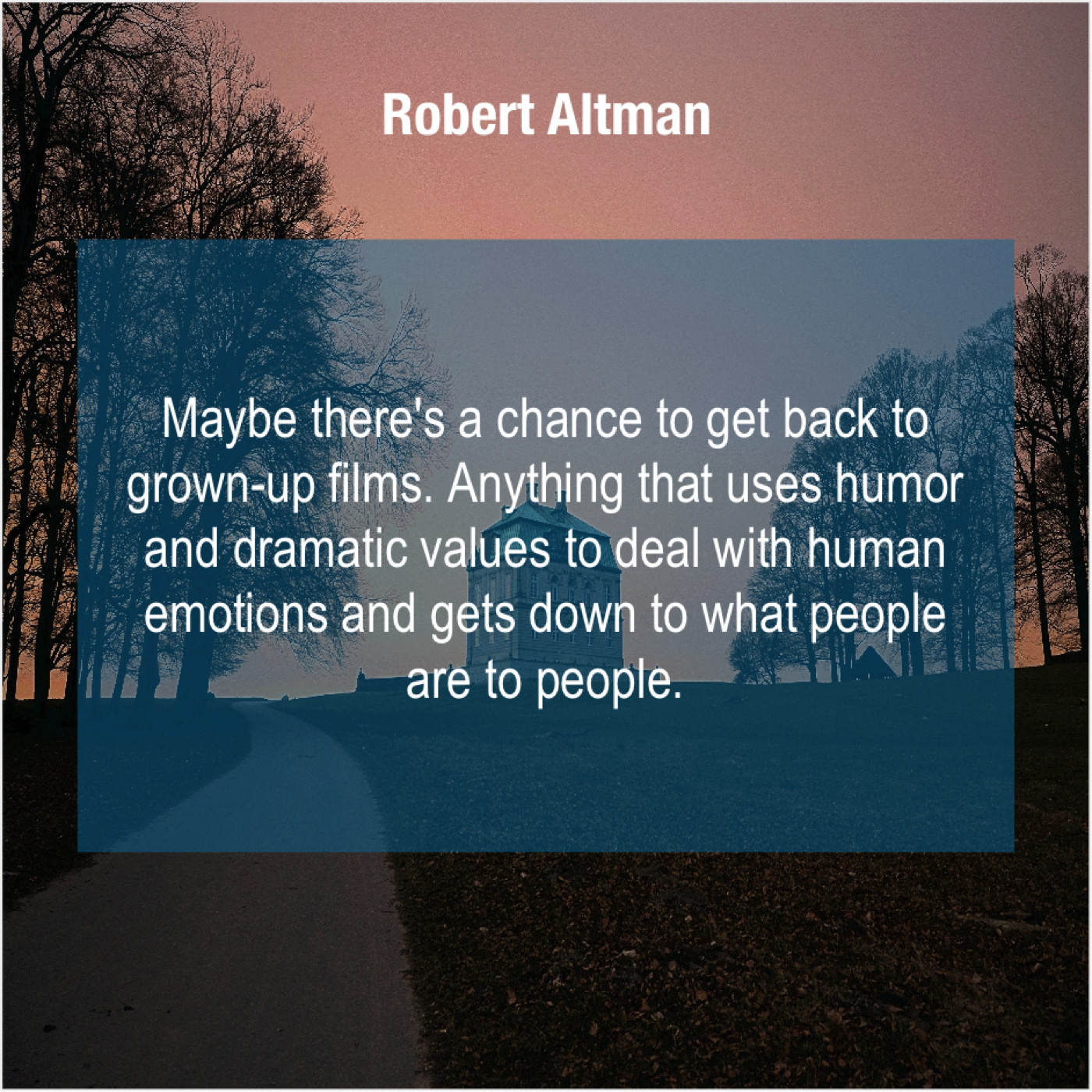 Robert Altman Robert Altman – Maybe there’s a chance to… May 3, 2019 admin “Maybe there’s a chance to get back to grown-up films. Anything that uses humor and dramatic values to deal with human emotions and gets down to what people are to people.”-Robert Altman