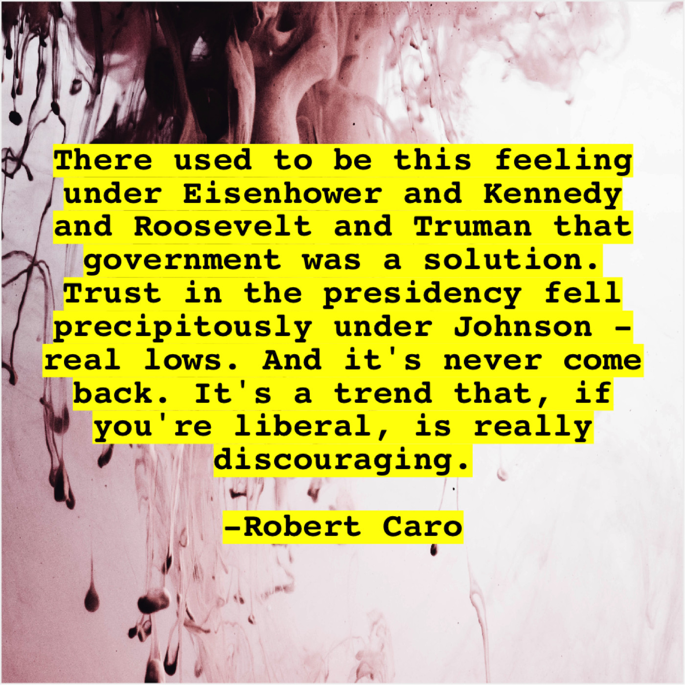 “There used to be this feeling under Eisenhower and Kennedy and Roosevelt and Truman that government was a solution. Trust in the presidency fell precipitously under Johnson – real lows. And it’s never come back. It’s a trend that, if you’re liberal, is really discouraging.”