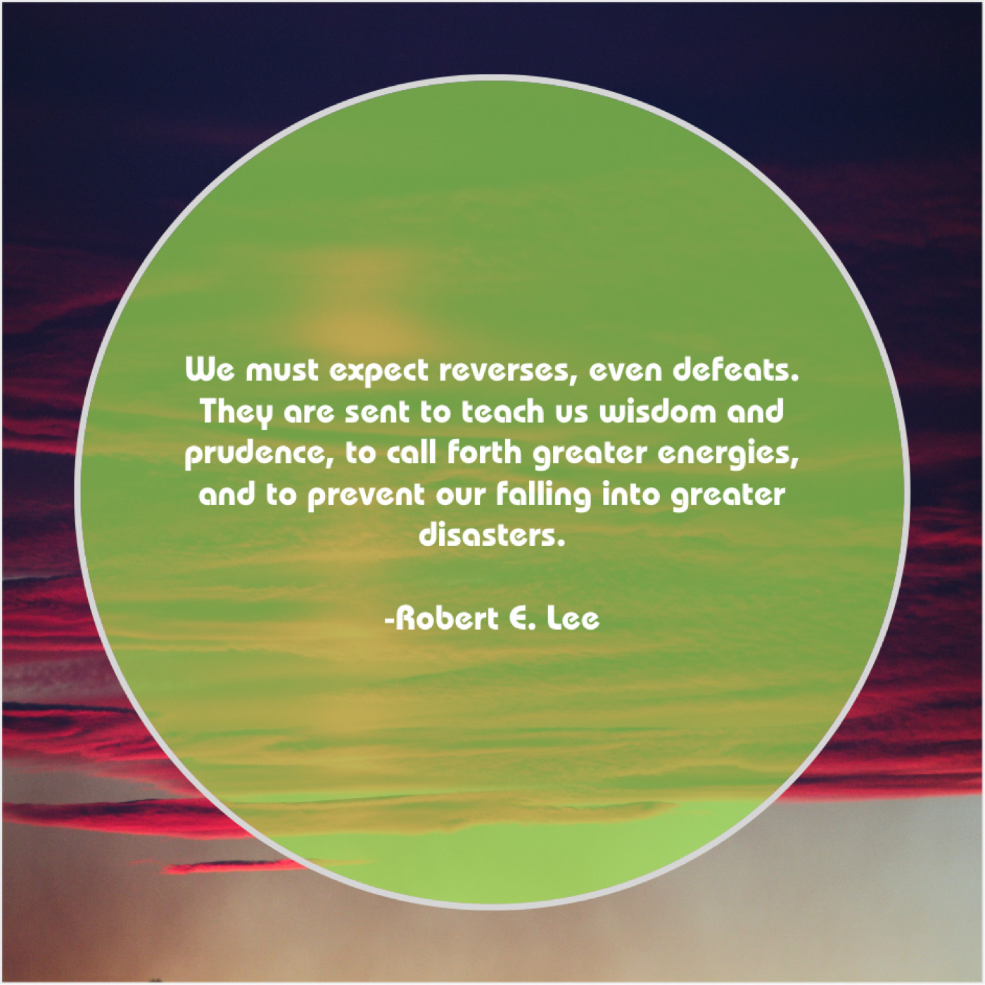 Robert E. Lee Robert E. Lee – We must expect reverses, even… June 12, 2019 admin “We must expect reverses, even defeats. They are sent to teach us wisdom and prudence, to call forth greater energies, and to prevent our falling into greater disasters.”-Robert E. Lee