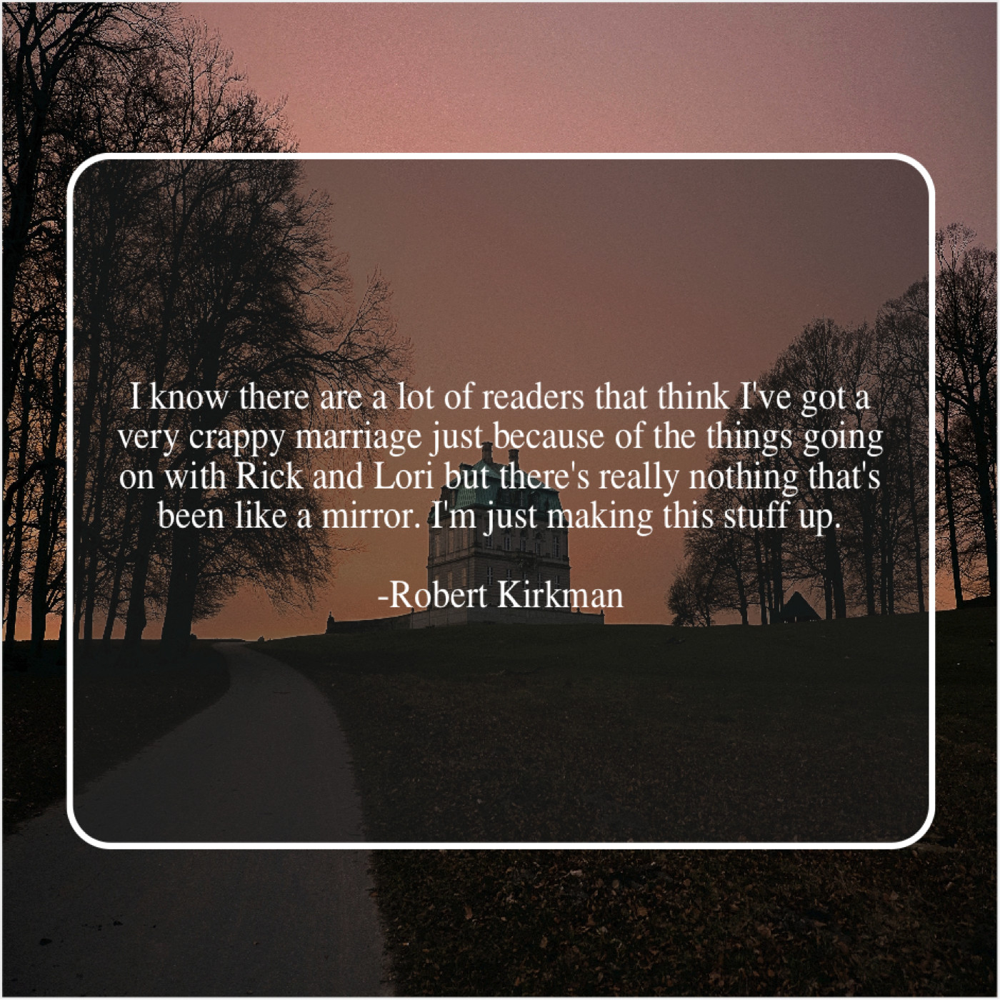 Robert Kirkman Robert Kirkman – I know there are a… April 12, 2019 admin “I know there are a lot of readers that think I’ve got a very crappy marriage just because of the things going on with Rick and Lori but there’s really nothing that’s been like a mirror. I’m just making this stuff up.”-Robert Kirkman