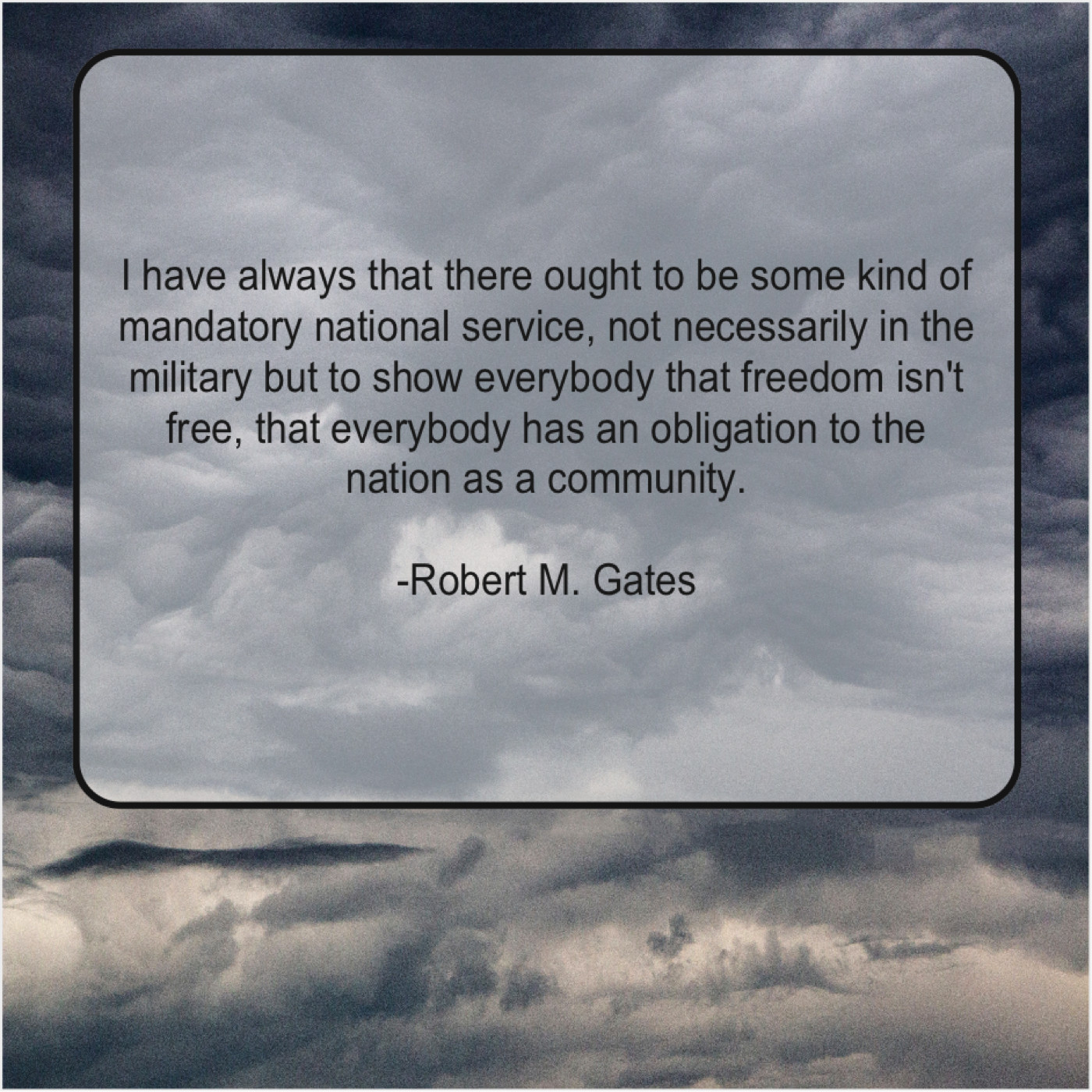 Robert M. Gates Robert M. Gates – I have always that there… May 14, 2019 admin “I have always that there ought to be some kind of mandatory national service, not necessarily in the military but to show everybody that freedom isn’t free, that everybody has an obligation to the nation as a community.”-Robert M. Gates